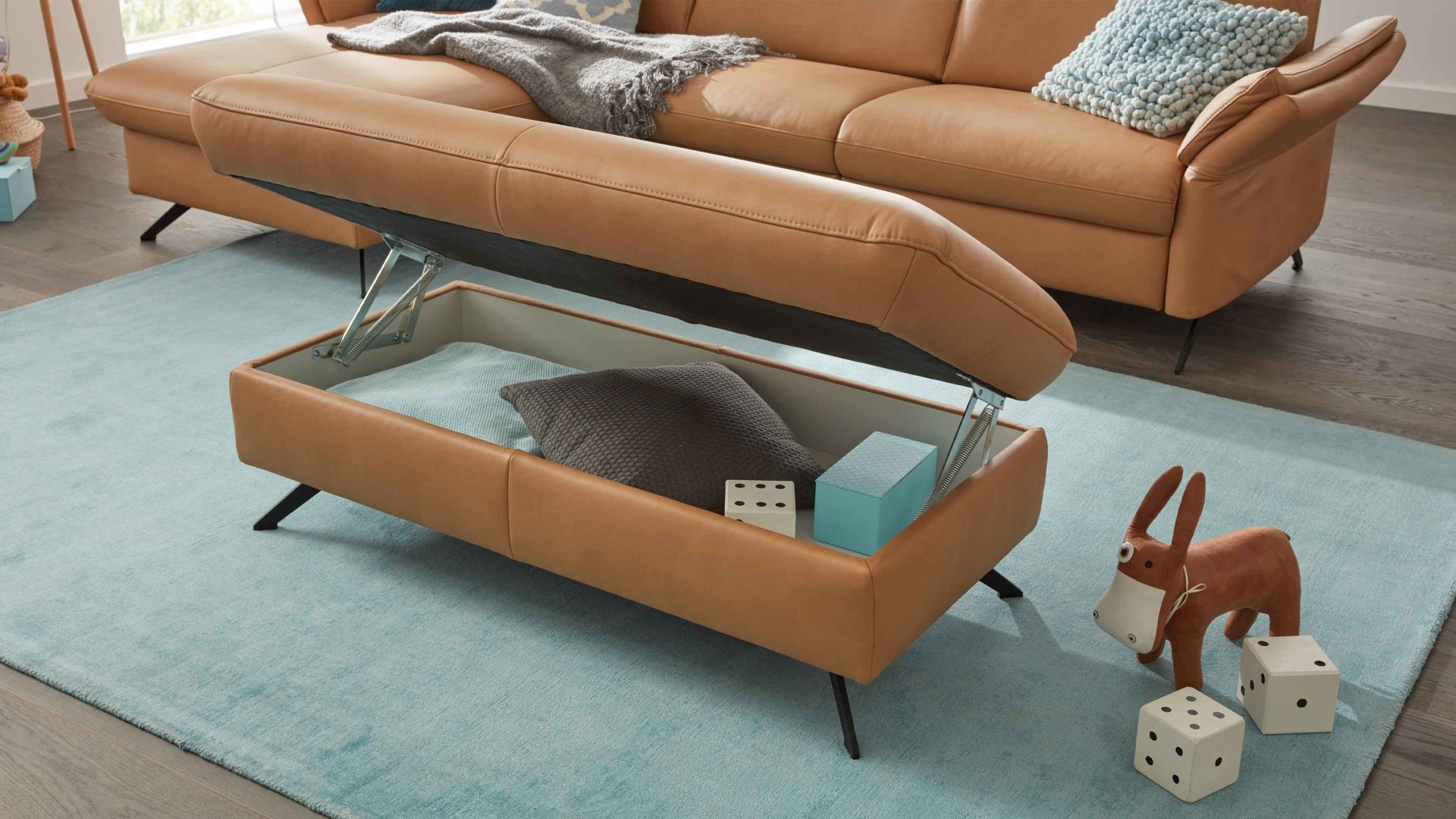Die manuelle Aufklappfunktion geht mit praktischem, innen weiß beschichteten und belüfteten Stauraum für Wohntextilien, Spielzeug und andere Gegenstände einher.