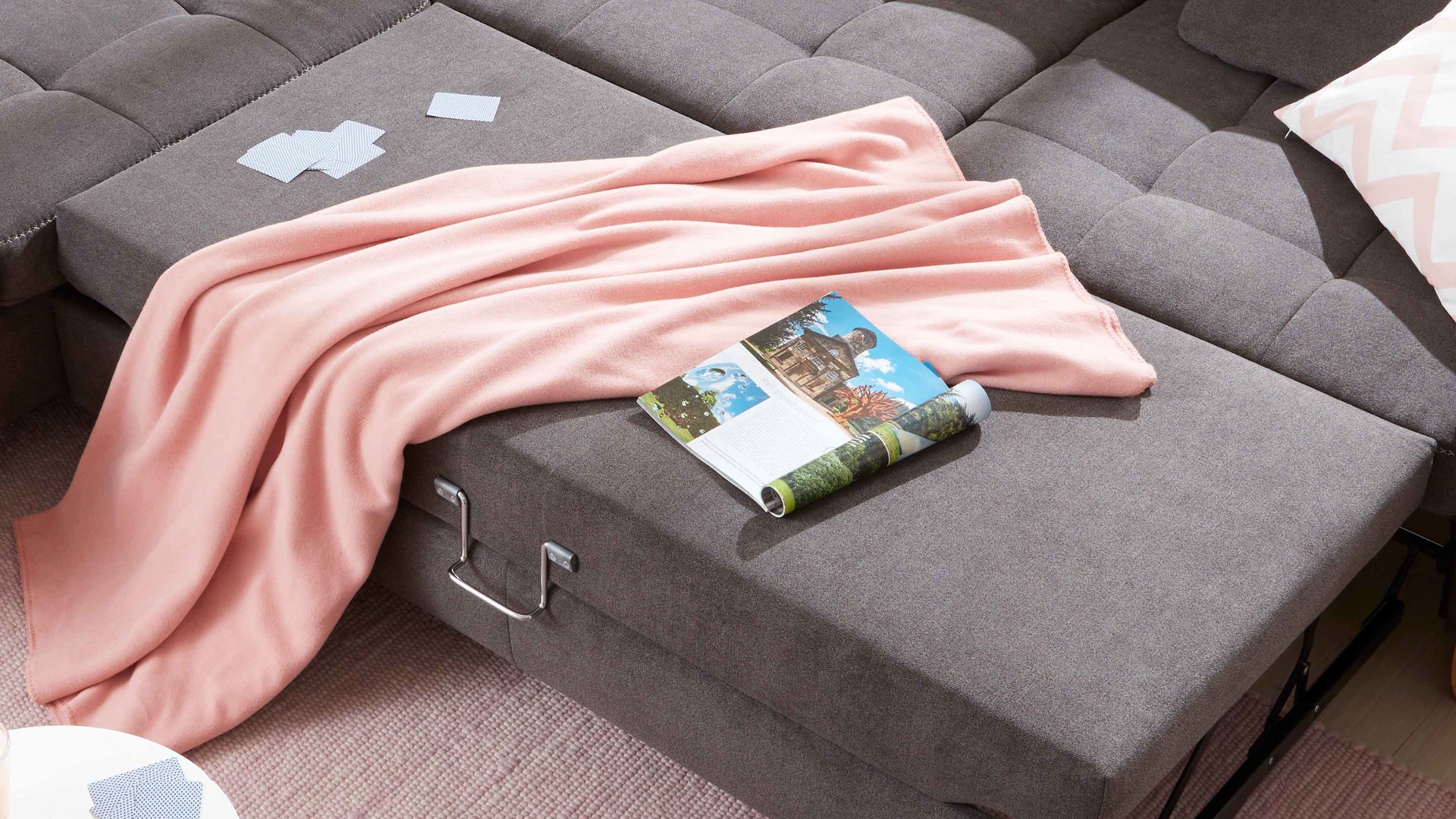 Bei der stoffbezogenen Liegefläche handelt es sich um einen stilvollen Mehrpreis für die Möbel mit Bettfunktion aus dem Modulmaster-Polsterprogramm MM-PP1058. Durch dieses Extra präsentiert sich die Liegefläche statt mit hochwertigem Drell im Originalstoff des jeweiligen Sofas. Der schieferfarbene Mikrochenillebezug strahlt moderne Eleganz aus.
