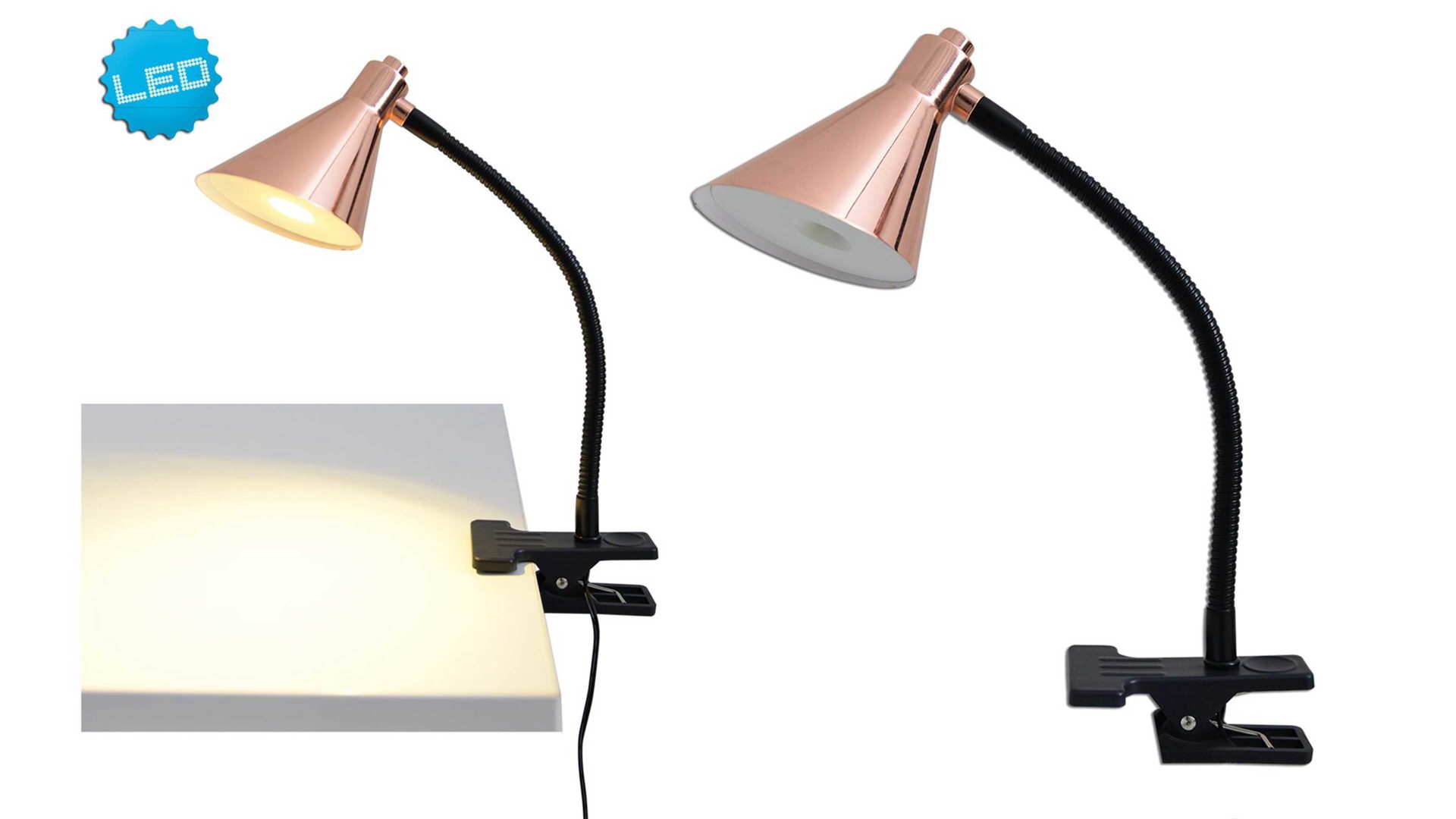 Geliefert wird die ansprechend gestaltete Klemmleuchte mit einer LED. Das Leuchtmittel erbringt eine Leistung von 3,5 Watt. Durch den Lichtstrom von 300 Lumen und die Farbtemperatur von 3000 Kelvin sendet die Leuchtdiode sehr helles und angenehm warmweißes Licht aus. Die LED ist der hohen Energieeffizienzklasse A+ zugeordnet und hat eine Lebensdauer von bis zu 20.000 Stunden. Zu den Vorteilen der Lampe gesellt sich überdies der Flexarm. Um die Leuchte zu bedienen, steht ein Ausschalter zur Verfügung.