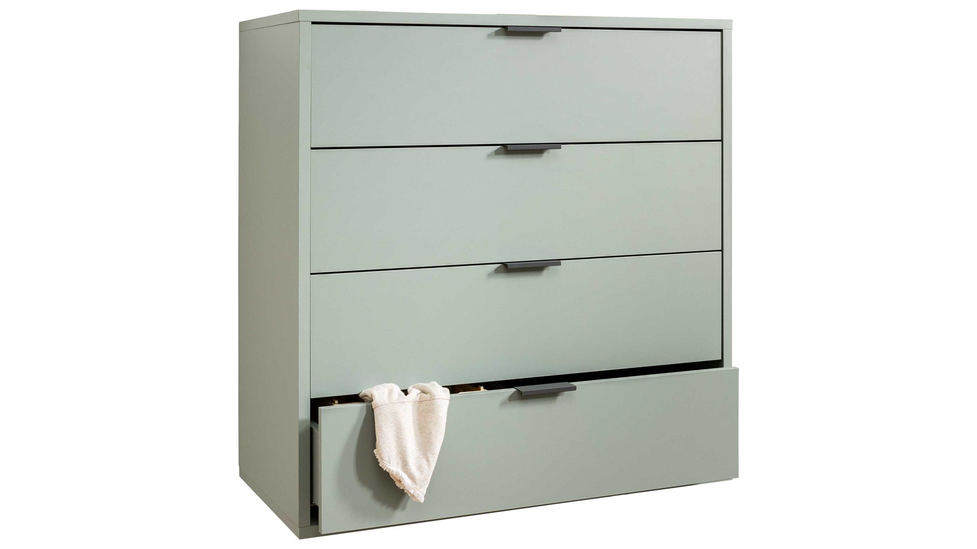 Mit ihren piniengrünen Mattlackoberflächen verkörpert die Schubladenkommode Bonnie moderne Eleganz. Schwarze Metallgriffe und praktisch höhenverstellbare Möbelgleiter runden das stilvolle Design harmonisch ab. Zu den qualitativen Höhepunkten gehören überdies die widerstandsfähigen abgerundeten Dickkanten.