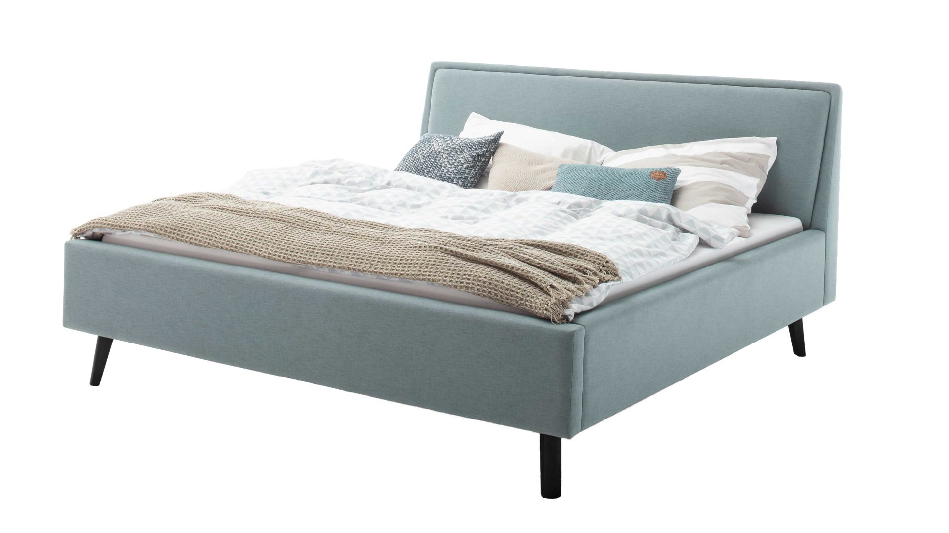 Das Polsterbettgestell Frieda mit Bettkasten verkörpert modernen Komfort. Mit dem eisblauen Stoffbezug und den schwarzen Holzfüßen präsentiert es sich elegant und gemütlich designt. Die Bettseiten sind genauso wie das Polsterkopfteil glatt bezogen. Letzteres ist eine angenehm weiche Rückenlehne, wenn Sie abends im Bett vor dem Schlafen noch entspannt in Ihrem Buch lesen oder fernsehen möchten.