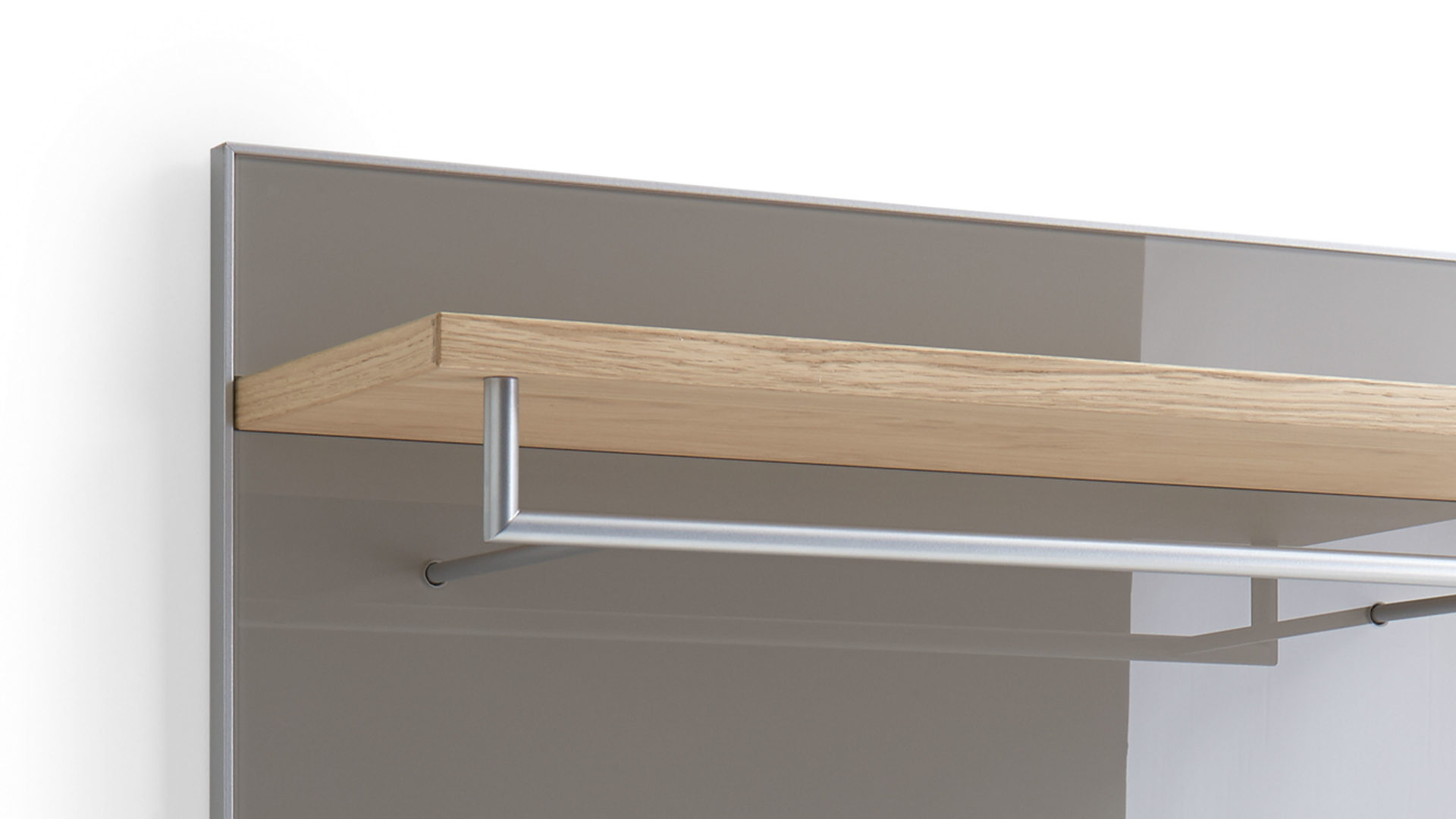 Durch die gelungene Kombination aus taupefarbenem Glas für das Paneel, Eiche Bianco Furnier für die Ablage und edelstahlfarbenem Metall für Stange und Haken strahlt die erstklassig verarbeitete Flurgarderobe moderne Eleganz gepaart mit natürlichem, warmem Charme aus. Der holzfarbene Ablageboden bietet Ihnen Stauraum für Hüte, Schirme und andere Accessoires, die Sie griffbereit positionieren wollen. An der Metallstange und den fünf Metallhaken können Sie Ihre Jacken und Mäntel bequem aufhängen. Die Maße des praktischen Garderobenpaneels belaufen sich auf ca. 80 x 109 x 27 cm (BxHxT).