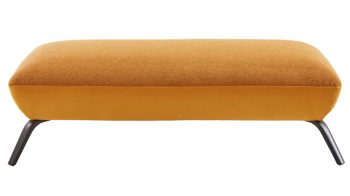 Er verbindet eine Stoffkombination aus senffarbenem Flachgewebe und goldfarbener Maschenware mit mattschwarzen Metallfüßen. Dank der hochwertigen PUR-Schaumpolsterung auf einer erstklassigen Wellenunterfederung genießen Sie auf diesem Hocker hervorragenden Sitzkomfort.