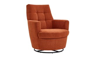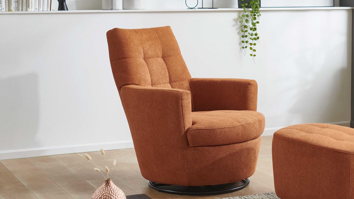 Mit seinem Signal-orangen Strukturbezug und dem schwarzen Metalldrehring wird dieser Sessel zum Blickfang in jedem Raum.