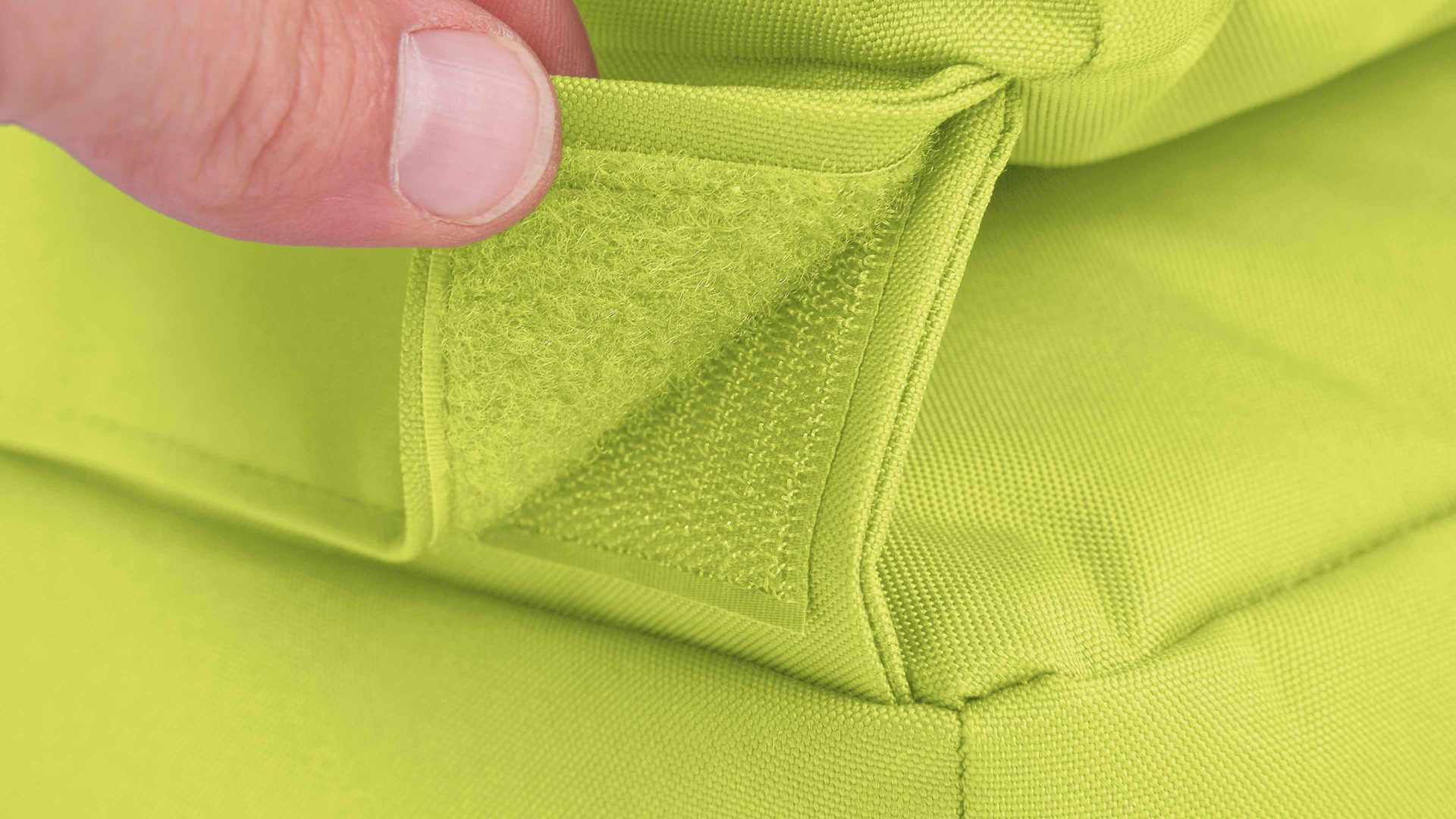 Durch seine dicht gewebte Struktur ist der Stoff besonders widerstandsfähig, unempfindlich gegenüber Nässe und leicht zu reinigen. Eine zusätzlich aufgebrachte PVC-Beschichtung auf der Innenseite des Stoffes macht scuba® zudem extrem robust und reißfest. Zugleich ist er angenehm weich und bequem. Der schwer entflammbare Bezug macht den Sessel zum perfekten Begleiter für Garten, Terrasse und Balkon. Ist die Füllung entfernt, lässt sich der Bezug bei 40 Grad im Schonwaschgang waschen.