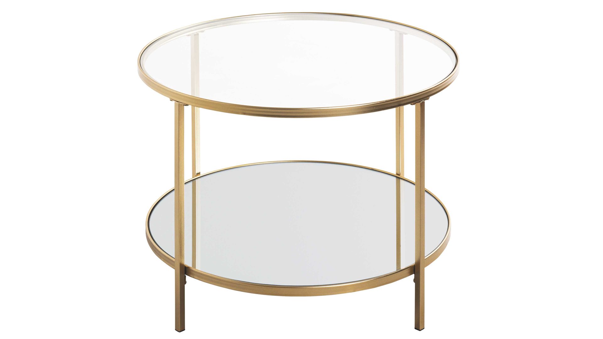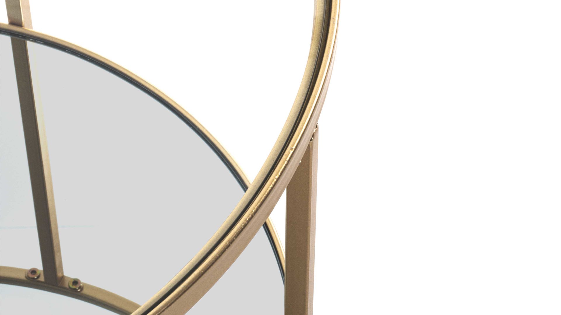 Der Beistelltisch ist mit seinem modernen und eleganten Design ein absoluter Hingucker. Er kombiniert ein goldfarben lackiertes Metallgestell mit zwei Ablagen: Die obere besteht aus Sicherheitsglas und die untere aus Spiegelglas. Dank der hochwertigen Materialien ist das Tischchen robust, widerstandsfähig und langlebig. Seine Maße belaufen sich auf ca. 45 x 60 cm (HxD).