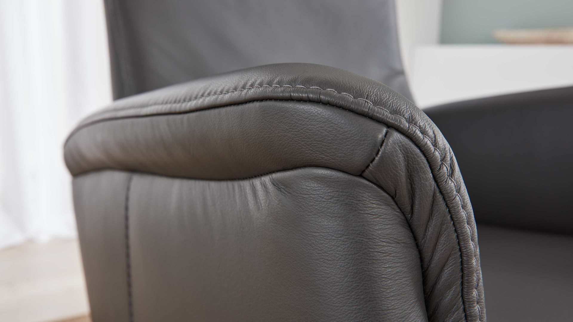 Der Modulmaster Relaxsessel MM-PN1062 ist exzellent verarbeitet und besonders stilvoll designt. Mit dem anthrazitfarben pigmentierten Glattlederbezug samt Ton-in-Ton-Kappnaht strahlt er moderne Eleganz aus. Für hohe Standfestigkeit sorgt der mattschwarze Aluminium-Sternfuß V1S, der die Optik zudem harmonisch abrundet.