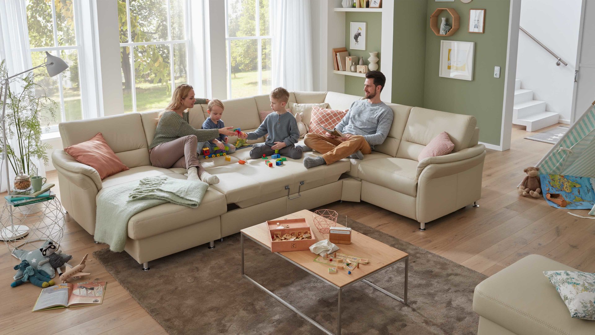 • Die Abbildung zeigt ein Wohnbeispiel, welches auch Dekoration sowie separat erhältliches Zubehör enthält. Im Lieferumfang enthalten ist eine Wohnlandschaft ohne Funktionen.
