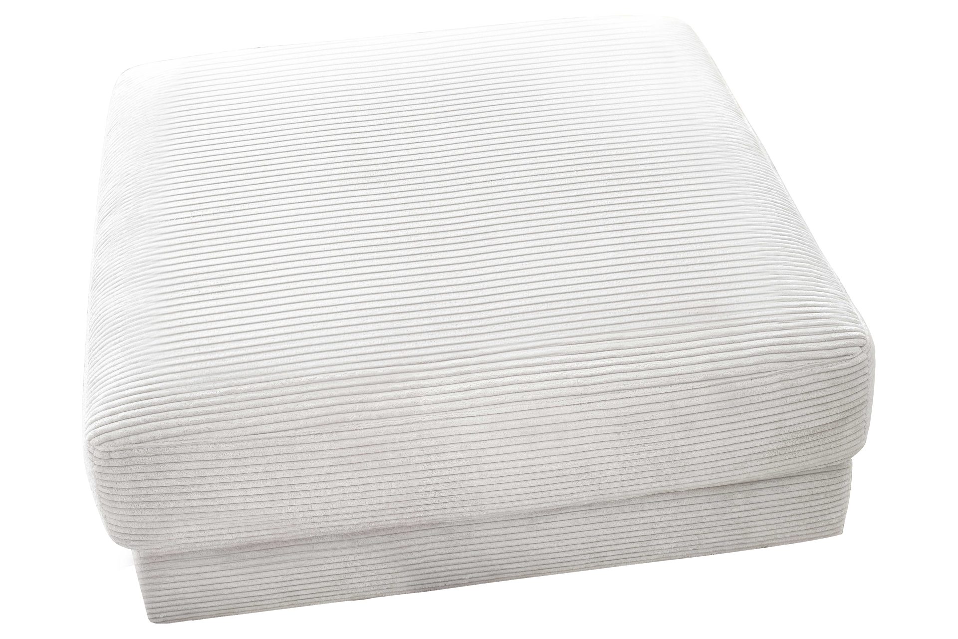 Der Polsterhocker aus dem Polsterprogramm SOFAkultur Seventies ist mit schneeweißem Cord bezogen und mit schwarzen Kunststoff-Gleitfüßen versehen. Er strahlt Modernität und Gemütlichkeit aus. Dank der schichtweise aufgebauten PUR-Schaumpolsterung auf einer gut stützenden Wellenunterfederung bietet der Hocker hohen Sitzkomfort. Er eignet sich auch als praktische Fußablage.