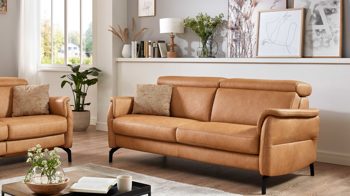 • Die Abbildung zeigt ein Wohnbeispiel, welches auch Dekoration sowie separat erhältliches Zubehör enthält. Im Lieferumfang enthalten ist ein Ledersofa 2200_89 mit Metallfüßen in matt schwarz.