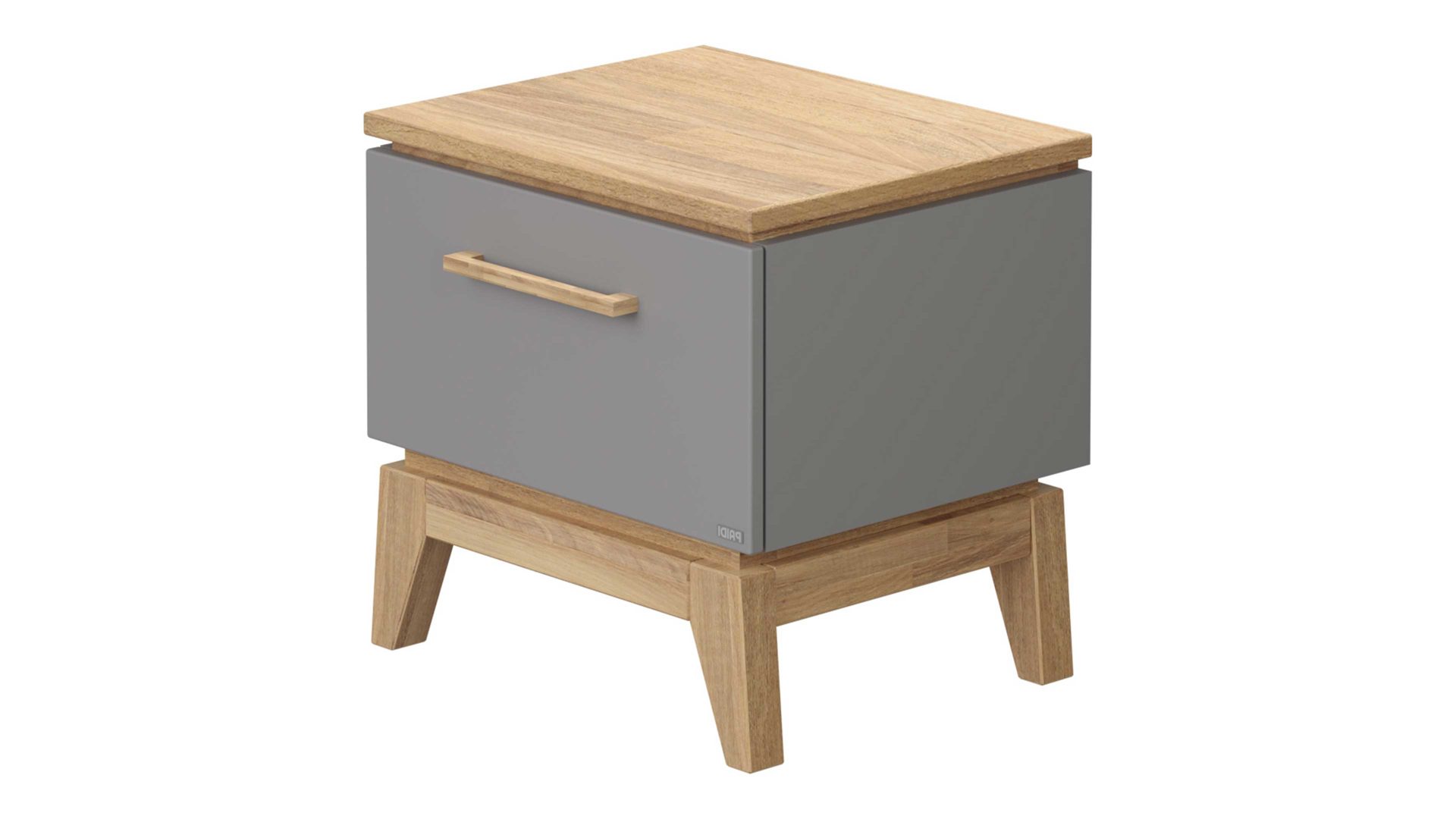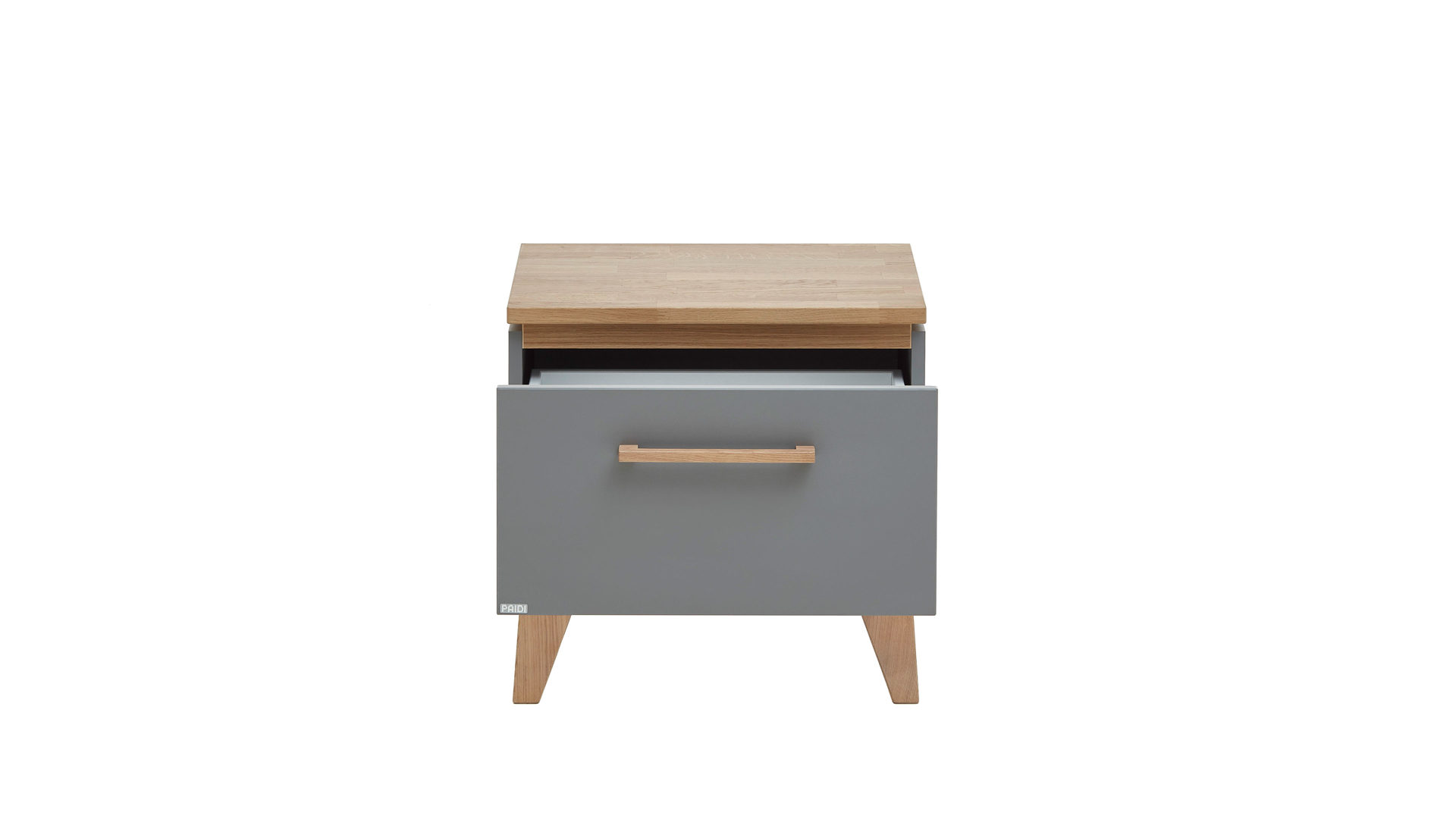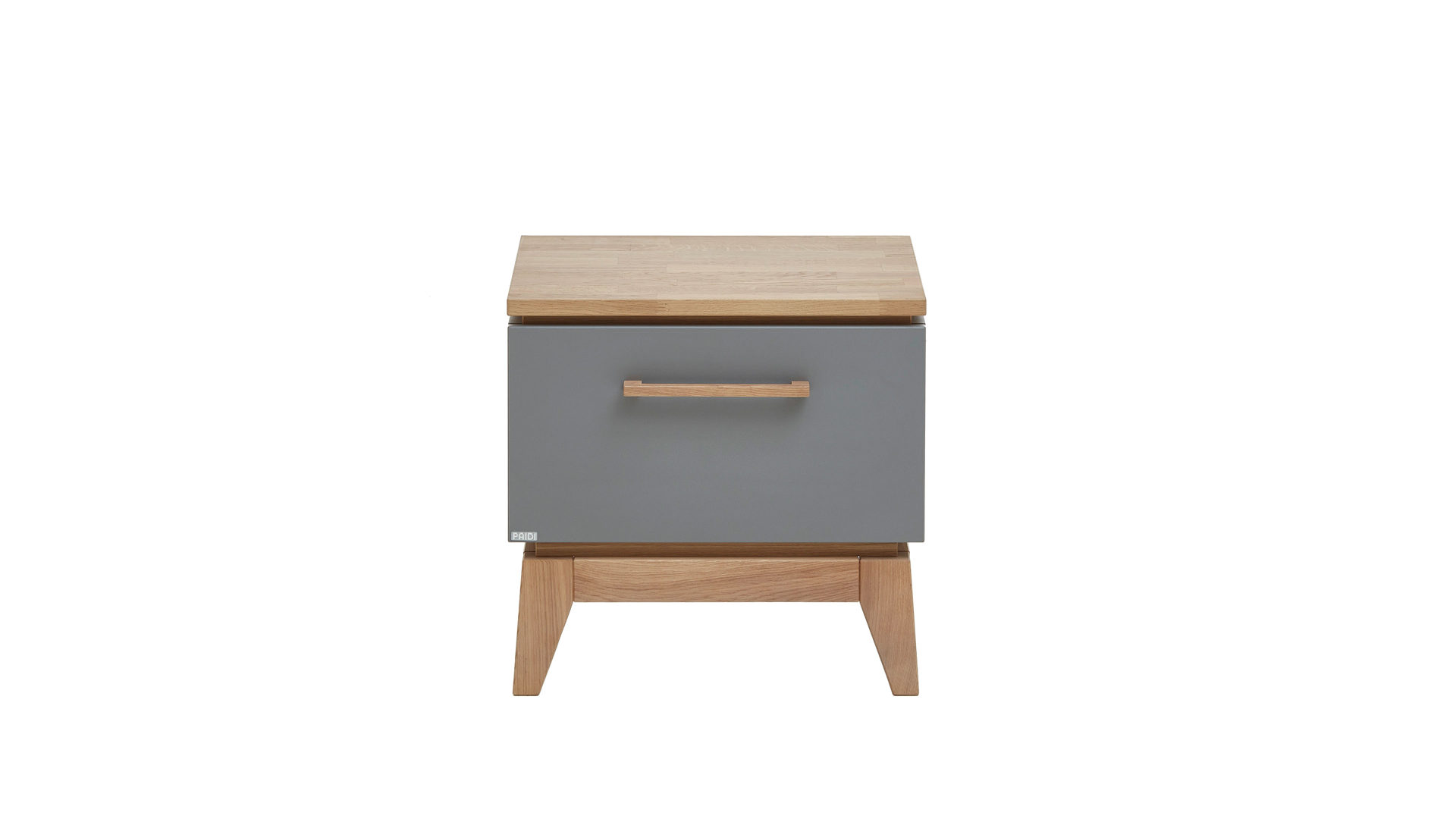 Die hochwertige PAIDI Nachtkommode Sten kombiniert massive Eiche mit schiefergrauen Melaminoberflächen. Letztere zeichnen sich durch ihre Lichtechtheit sowie die besonders ausgeprägte Kratz- und Stoßfestigkeit aus. Überdies sind sie sehr pflegeleicht. Die massive Eiche begeistert mit ihrer extremen Robustheit und Stabilität. Zudem strahlt sie warme Natürlichkeit aus. Der Holzton harmoniert wunderbar mit dem Schiefergrau. Zusammen sorgen die Nuancen für eine moderne und elegante Optik.