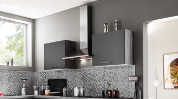 • Die Abbildung zeigt ein Wohnbeispiel, welches auch Dekoration sowie separat erhältliches Zubehör enthält. Im Lieferumfang enthalten sind eine Kücheninsel und eine Hochschranklösung.