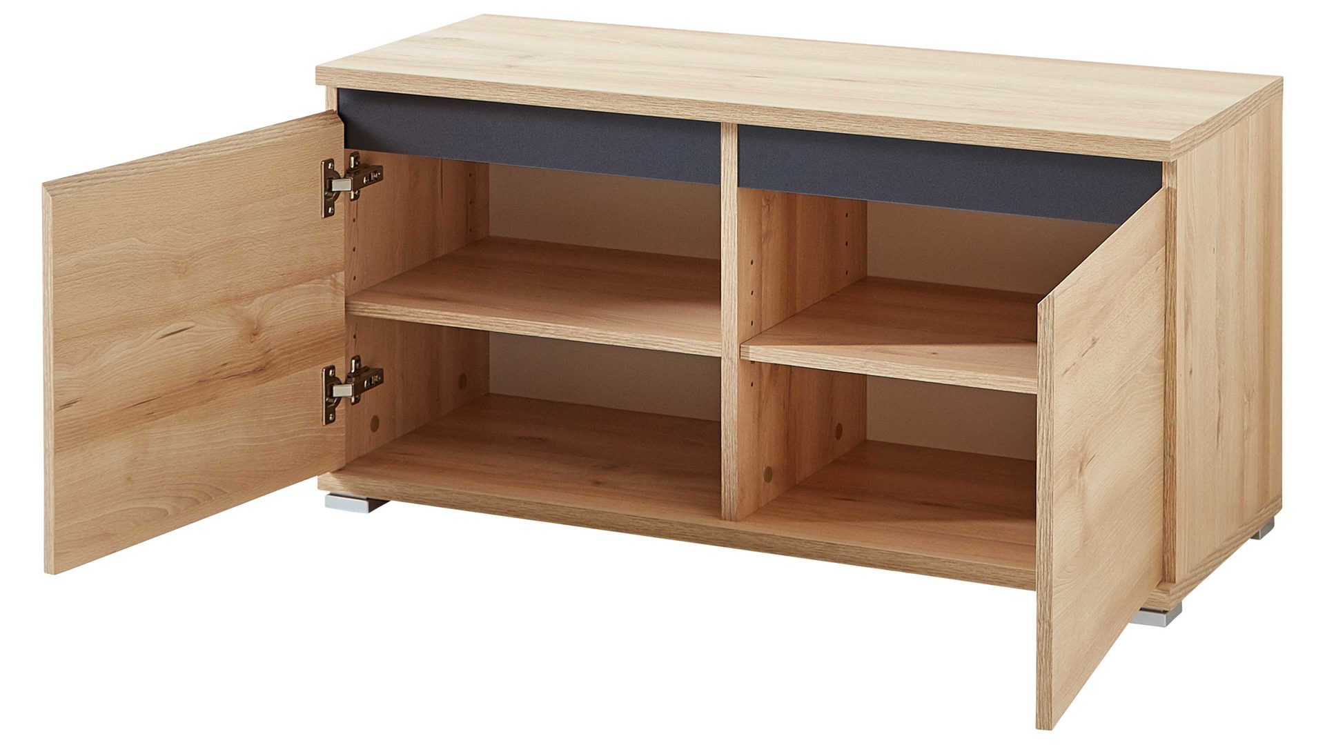 Insgesamt bietet die Garderobenbank mit zwei Türen und je einem Boden dahinter viel Stauraum für Ihre Schuhe und fasziniert zugleich außen mit Applikationen in Anthrazit. Des Weiteren verfügt das Garderobenmöbel über ABS-Kanten, eine Türdämpfung und ein griffloses Design. Dank der Maße von ca. 96 x 52 x 40 cm (BxHxT) benötigt die Schuhbank eine geringe Stellfläche. Ergänzende Möbel der Serie Lissabon erhalten Sie hier im Shop.