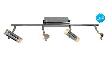 Er besteht aus verchromtem Metall sowie klarem Acrylglas. Somit ist die Deckenleuchte, die vier Spots aufweist, enorm widerstandsfähig, stabil und auch noch angenehm pflegeleicht.
