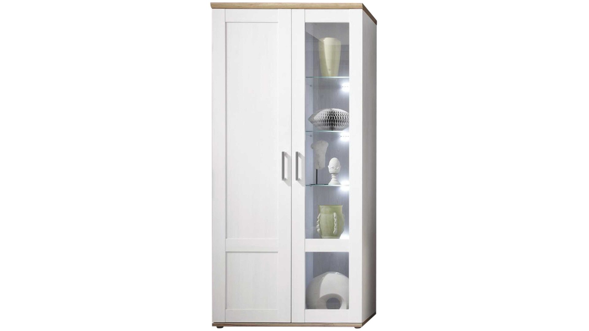 Ein Einrichtungstraum im skandinavischen Landhausstil ist diese vierteilige Wohnwand, die Maße von ca. 329 x 200 x 50 cm (BxHxT) aufweist. Gefertigt wurde sie aus Sibiu Lärche-Nachbildung in Kombination mit hellen San Remo Kunststoffoberflächen. Ein stattlicher Vitrinenschrank mit einer Holztür sowie einer Glastür, Maße ca. 93 x 202 x 46 cm (BxHxT), wird zum Blickfang der Wohnkombination. In seinem Inneren verbergen sich vier Glas- sowie vier Holzböden. Kaltweiße LED-Beleuchtung setzt die Glasböden der Vitrine geschmackvoll in Szene. Ein Wandboard mit Rückwand, Maße ca. 143 x 17 x 24 cm (BxHxT), kann als Abstellfläche für Bücher, DVDs oder Dekoaccessoires genutzt werden.