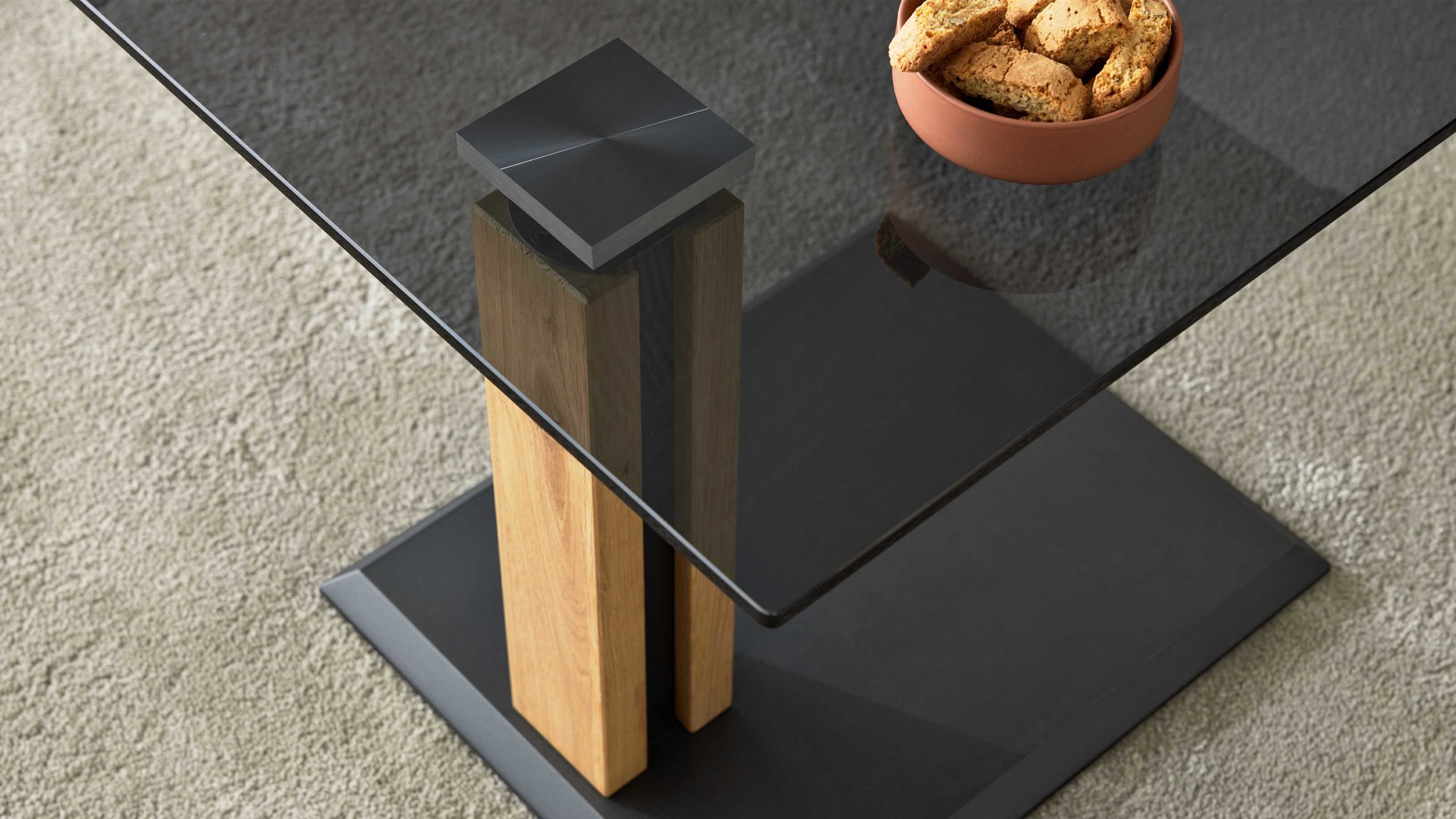 Ein besonderes Highlight ist die 10 mm starke ESG-Glasplatte, eingefasst in einen lackierten Metallrahmen, der dem Tisch eine feine Kontur und zusätzliche Stabilität verleiht. Die Metallelemente und die MDF-Bodenplatte sind anthrazit-metallicfarben lackiert und setzen moderne Akzente, die das hochwertige Erscheinungsbild perfekt abrunden. Durch die Kombination von Glas, Holz und Metall entsteht ein ausgewogener Mix aus Natürlichkeit, Leichtigkeit und industrieller Eleganz.