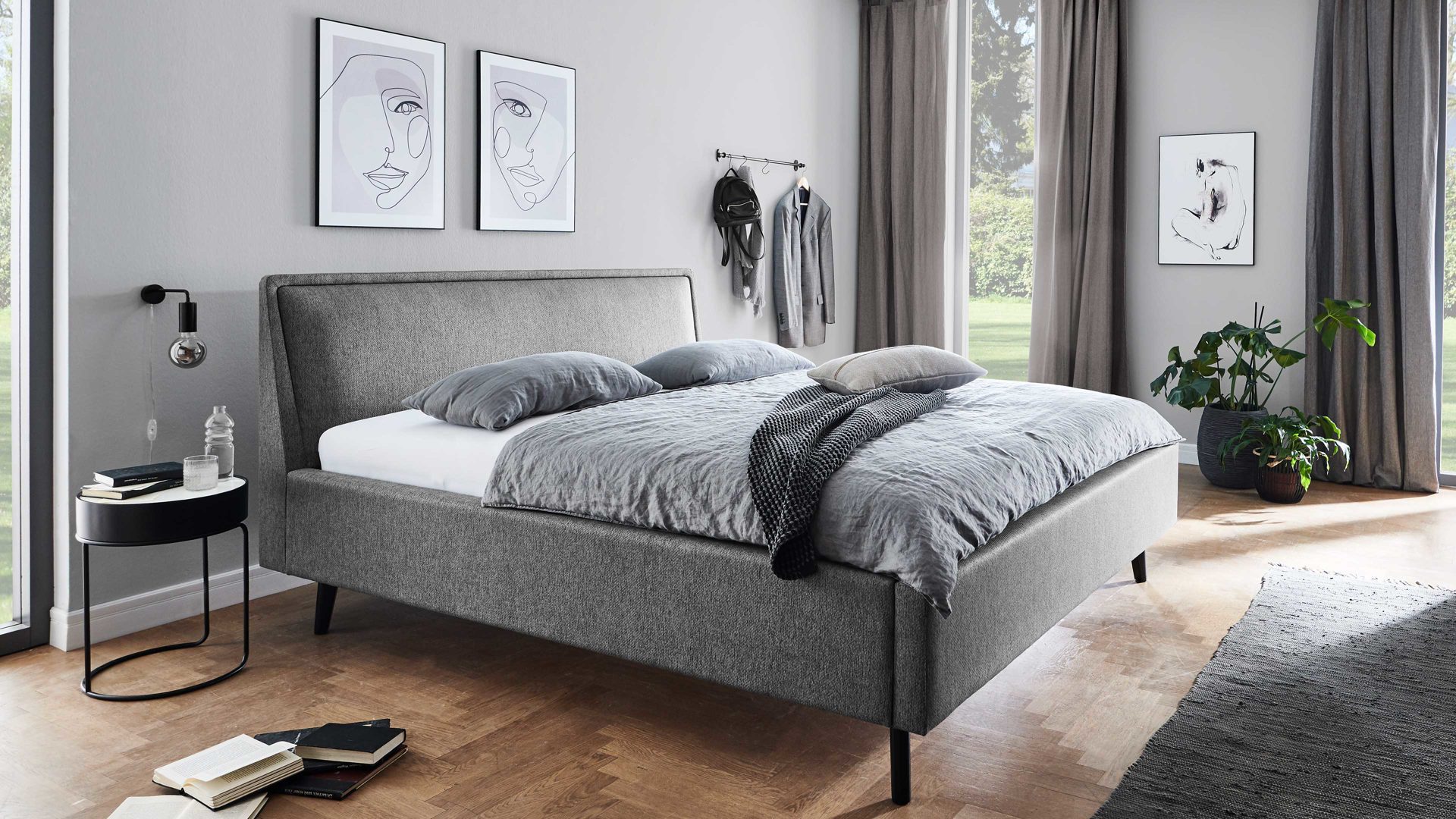 Das Polsterbettgestell Frieda mit Bettkasten verkörpert modernen Komfort. Mit dem grauen Stoffbezug und den schwarzen Holzfüßen präsentiert es sich elegant und gemütlich designt. Die Bettseiten sind genauso wie das Polsterkopfteil glatt bezogen. Letzteres ist eine angenehm weiche Rückenlehne, wenn Sie abends im Bett vor dem Schlafen noch entspannt in Ihrem Buch lesen oder fernsehen möchten.