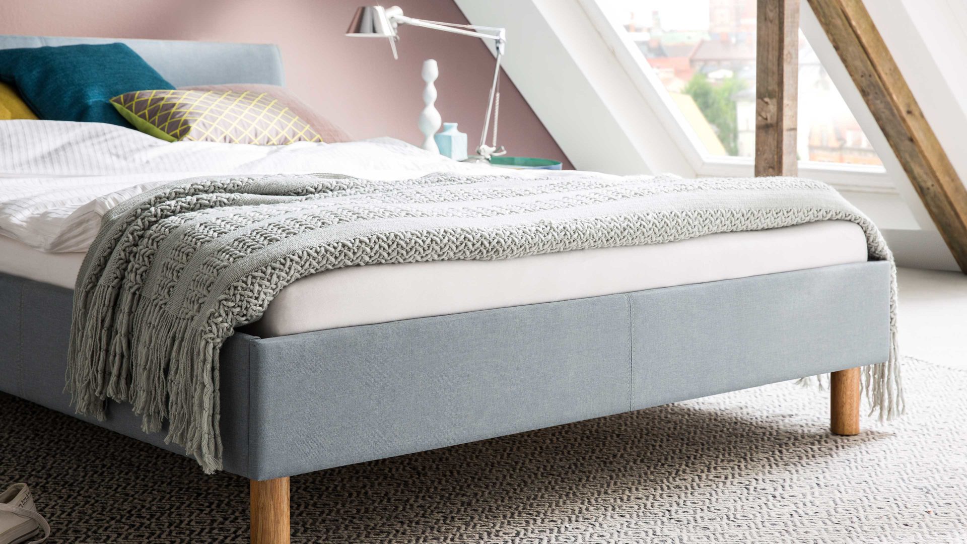 Mit dem edlen eisblauen Stoffbezug und den eichefarbenen Holzfüßen strahlt das Polsterbettgestell Lena frische Eleganz mit einer Prise Natürlichkeit aus. Sowohl die Bettseiten als auch das bequeme Polsterkopfteil sind glatt bezogen, was den gemütlichen Charakter des Bettes unterstreicht. Das angenehm weiche Kopfteil ist beispielsweise beim Lesen oder Fernsehen als praktische Rückenlehne nutzbar.