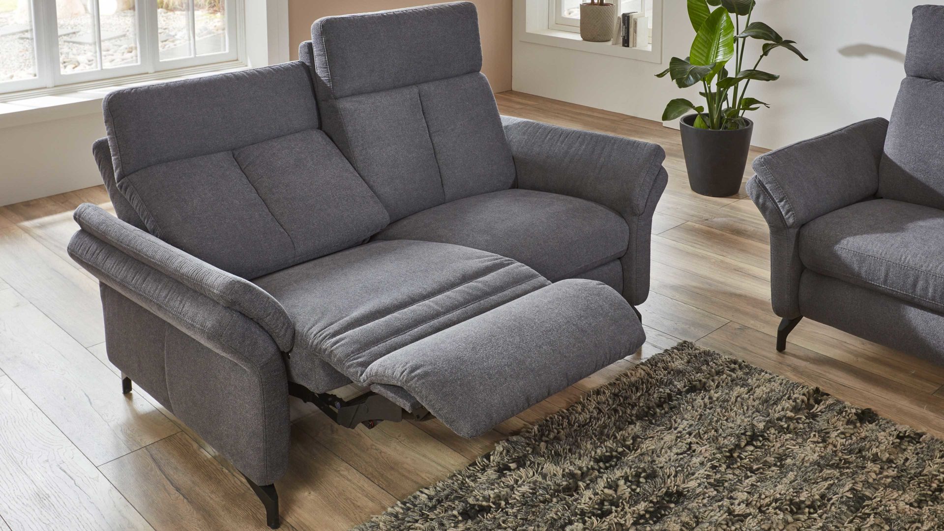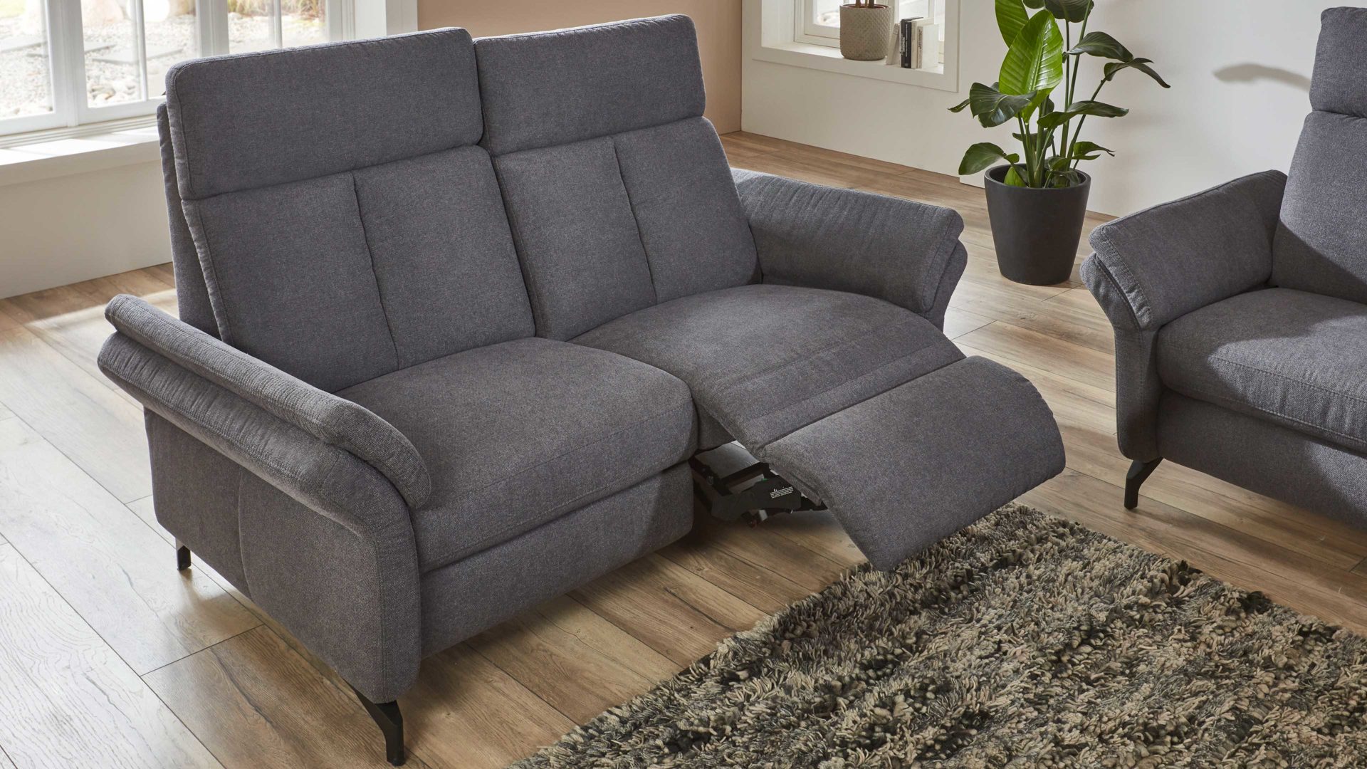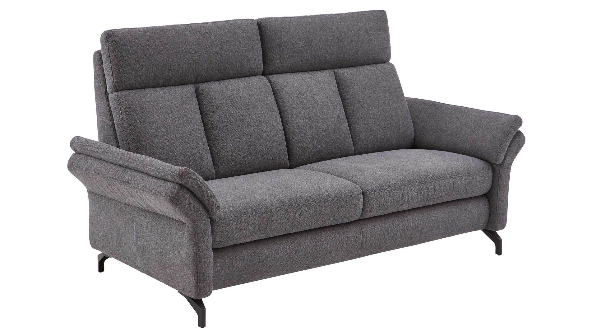 Der Zweisitzer mit TV-Funktion aus dem hochwertigen Polsterprogramm OrthoSedis 4.0 kombiniert einen edlen anthrazitfarbenen Stoffbezug mit mattschwarz lackierten Metallfüßen. Sowohl die Materialien als auch die Farben harmonieren perfekt und verleihen dem Sofa eine moderne und elegante Ausstrahlung. Durch das zeitlose Design fügt sich die Couch in verschiedene Einrichtungsstile passend ein.