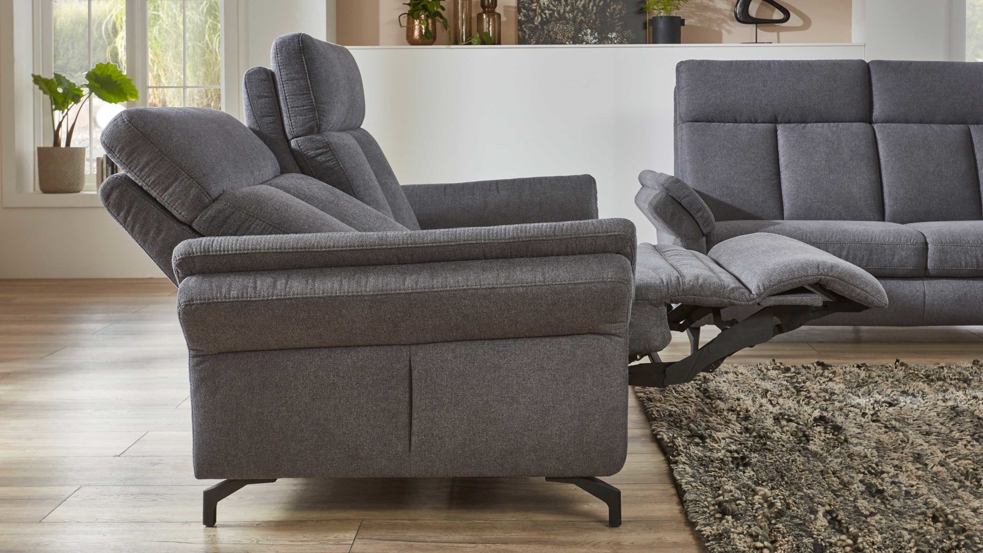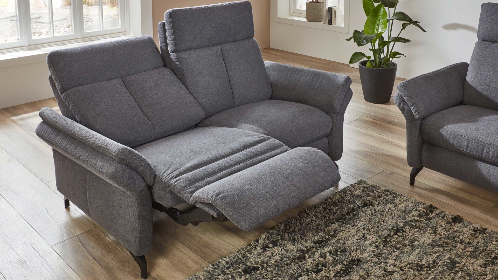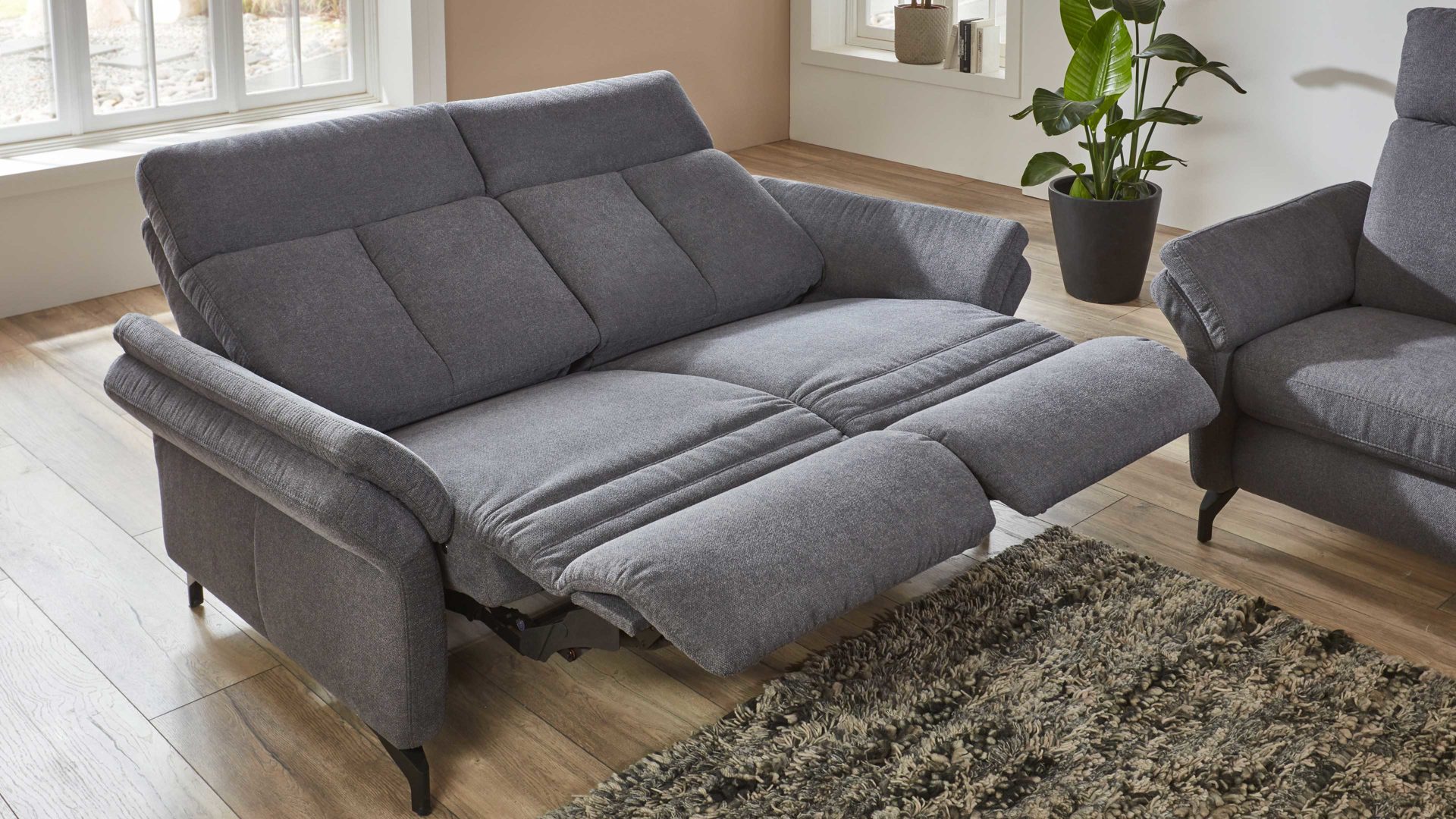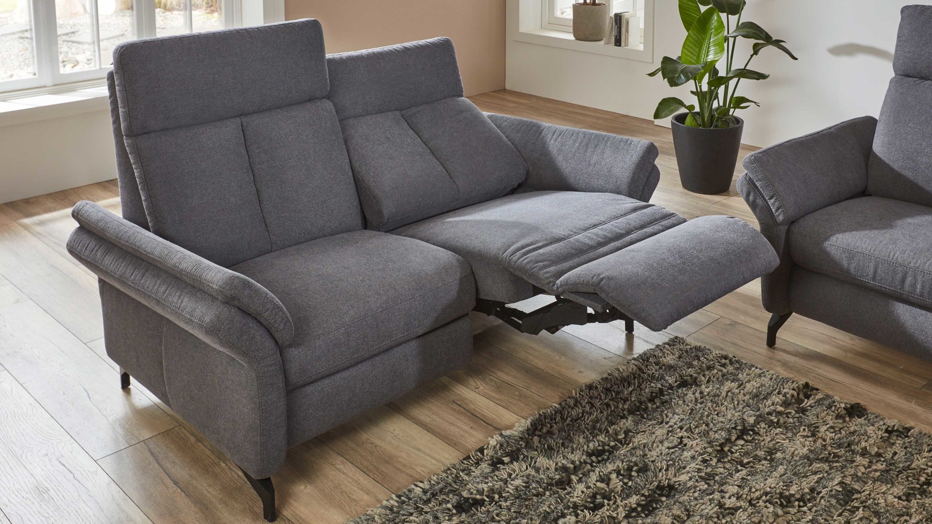 Der Zweisitzer mit TV-Funktion aus dem hochwertigen Polsterprogramm OrthoSedis 4.0 kombiniert einen edlen anthrazitfarbenen Stoffbezug mit mattschwarz lackierten Metallfüßen. Sowohl die Materialien als auch die Farben harmonieren perfekt und verleihen dem Sofa eine moderne und elegante Ausstrahlung. Durch das zeitlose Design fügt sich die Couch in verschiedene Einrichtungsstile passend ein.
