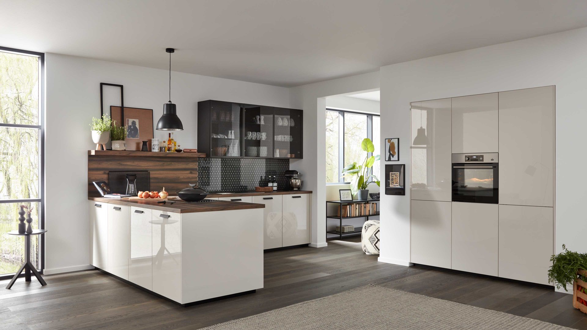 Die WERT KÜCHE® Ulrike kombiniert muschelweiße Hochglanzfronten mit Arbeitsplatten, Sockelleisten, einer Rückwandverkleidung und einem Regal in Nussbaum Tobacco-Nachbildung. Akzente setzen die Glasfronten sowie die gläserne Nischenverkleidung mit trendigem Rhombusmuster. Onyxschwarze Griffe und Glasrahmen runden das moderne Design harmonisch ab.