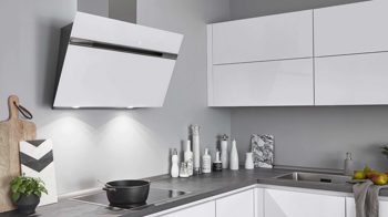Auf der linken Seite befindet sich der Kochbereich mit Glaskeramik-Kochfeld und kopffreier Dunsthaube. Hier profitieren Sie von komfortabler Bewegungsfreiheit und klar strukturierten Abläufen.