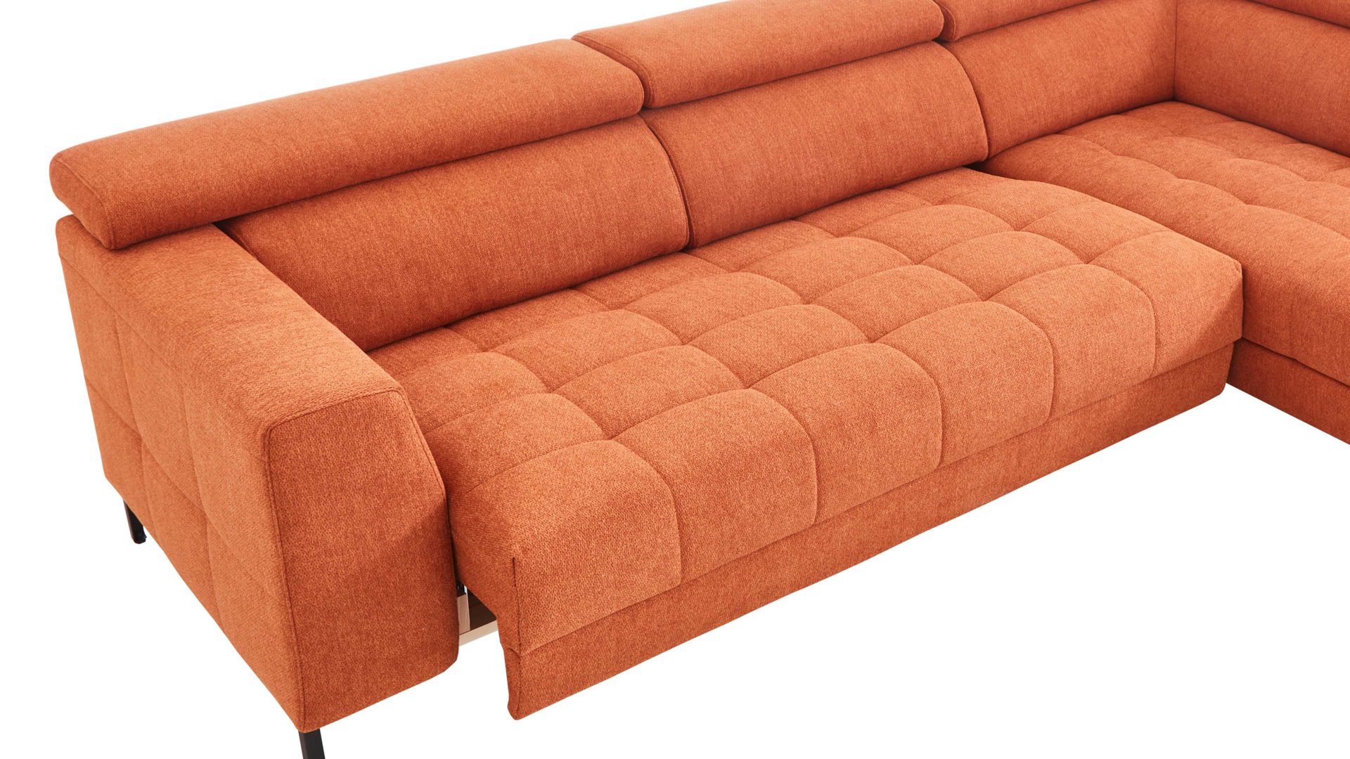 Des Weiteren können Sie zwischen zwei Fußfarben wählen und die Polsterecke ist standardmäßig mit einer Kopfteilverstellung ausgestattet.