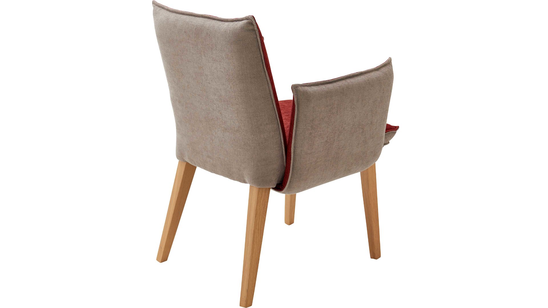 Mit einer auffälligen Farbkombination ist dieser Polsterstuhl mit Armlehnen und vier Eichenholzfüßen der Hingucker. Ob als Esszimmermöbel oder als Sitzmöbel in der Wohnküche. Sitzfläche und Rückenfläche sind mit leuchtendem Rot bezogen, wohingegen die Rückseite camelfarben ist. Die Knopfheftung im Rücken ist ein weiteres hübsches Detail.