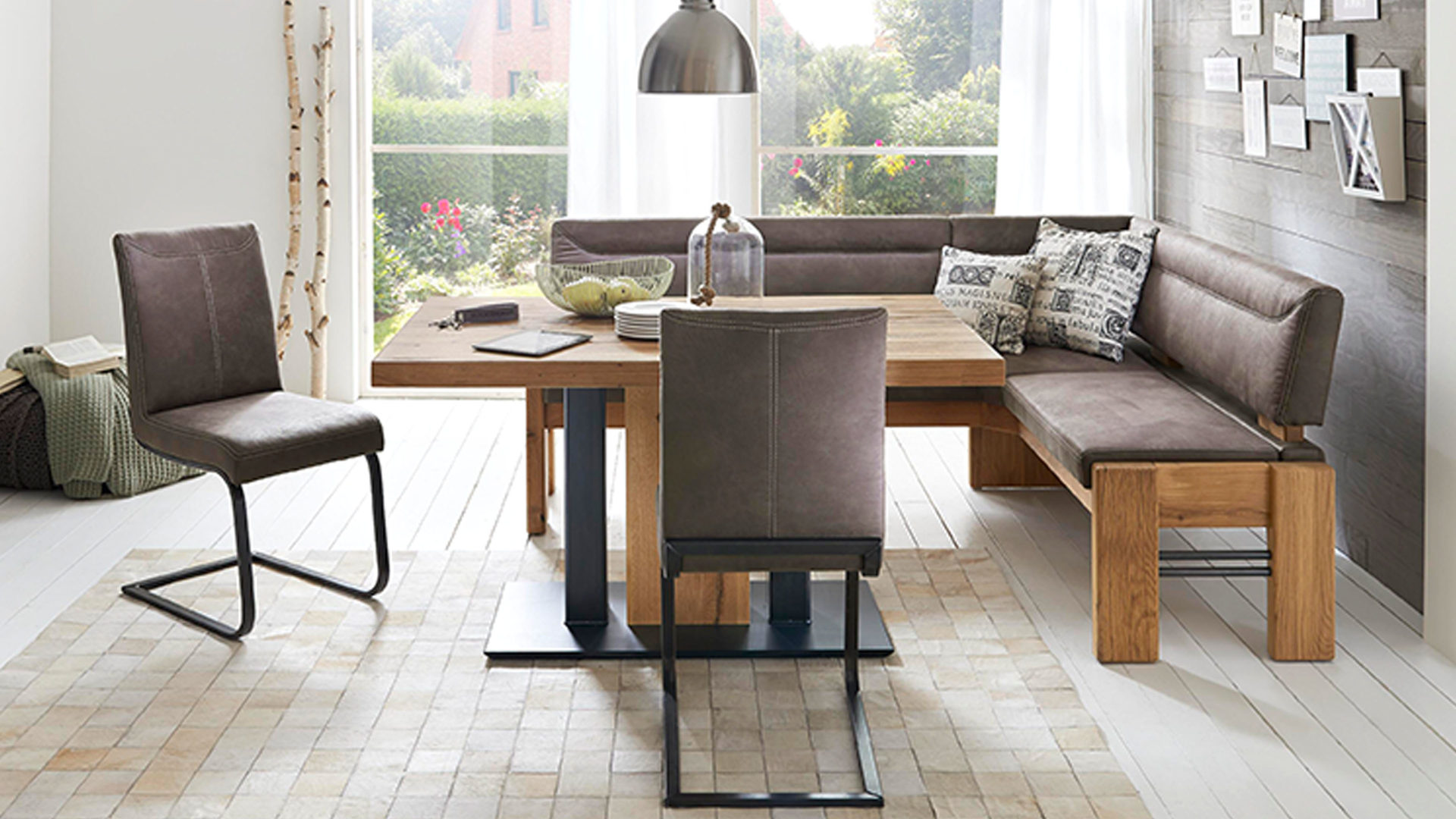 Die Abbildung zeigt ein Wohnbeispiel, welches auch Dekoration sowie separat erhältliches Zubehör enthält. Im Lieferumfang enthalten ist der Schwingstuhl Gino.