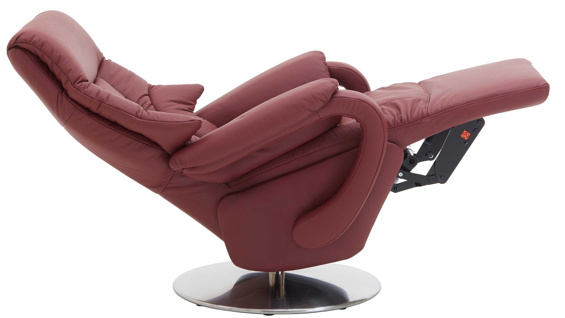 Dieser Relaxsessel kombiniert einen robusten glänzenden Edelstahl-Tellerfuß mit einem stilvollen merlotfarbenen Lederbezug. Durch die optimal aufeinander abgestimmten Materialien und Farben strahlt der Fernsehsessel moderne Eleganz aus. Für die nötige Stabilität sorgt der Stahlrohrrahmen. Er macht den TV-Sessel bis 130 kg belastbar. Die Maße des hochwertig verarbeiteten Relaxsessels belaufen sich auf ca. 80 x 116 x 80 cm (BxHxT), bei einer Sitzhöhe von ca. 49 cm und einer Sitztiefe von ca. 55 cm.
