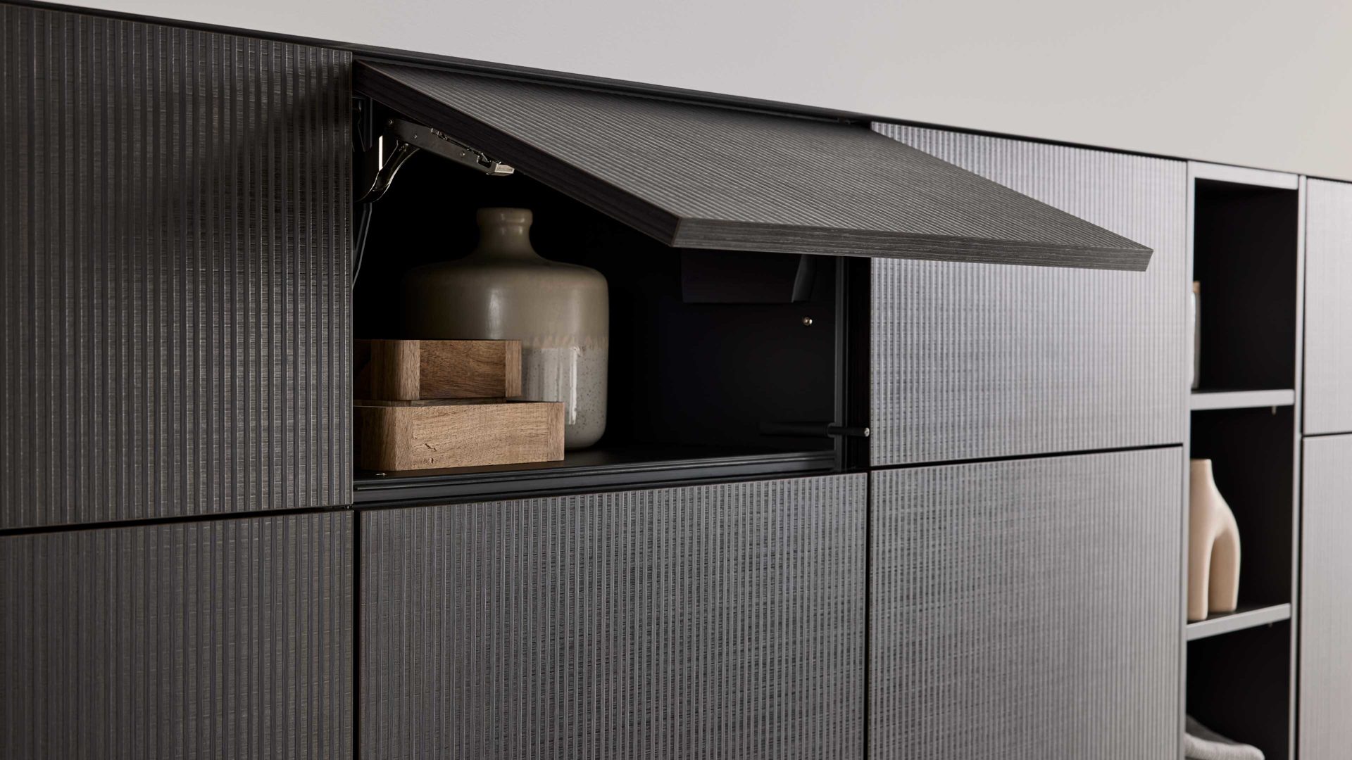Die Interliving Küche Serie 3069 vereint moderne Eleganz mit cleverer Raumplanung. Die Kombination aus weißen Hochglanz-Lacklaminatfronten und markanter Stripe-Wood-Coffee-Nachbildung sorgt für eine ausdrucksstarke Optik. Grifflos gestaltete Fronten und premiumweiße Arbeitsplatten runden das klare, geradlinige Erscheinungsbild perfekt ab – für ein stilvolles Küchenerlebnis mit Charakter.