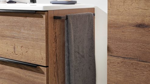 Der Handtuchbügel ist speziell für die seitliche Montage an Unterschränken vorgesehen. Die passenden Schrauben sind im Lieferumfang enthalten, sodass du ihn schnell und unkompliziert anbringen kannst. Mit Maßen von ca. 46 x 5 x 3,4 cm (B/LxHxT) bietet der Halter ausreichend Platz für Hand- oder Gästehandtücher – direkt griffbereit und elegant in Szene gesetzt.
