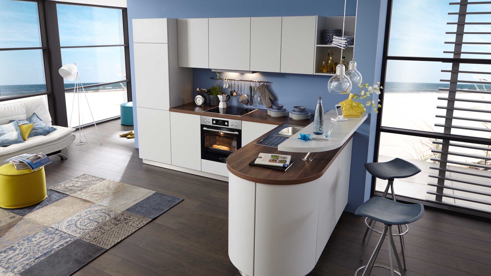 Der L-Block mit gerundeten Unterschrank-Elementen hat moderne Kunststoffoberflächen in Kristallgrau Satin und wirkt freundlich und offen. Der Wangenkorpus in Kristallgrau unterstreicht den modernen Look.