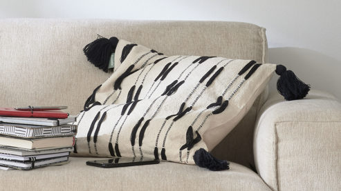 Kissenbezug mit aufwändig eingenähten Wollfäden, unifarbener Rückseite und Quasten an jeder Ecke