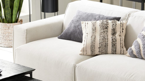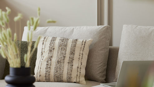 Kissenbezug mit eingenähten schwarzen Wollfäden, unifarbener Rückseite und verdecktem Reißverschluss