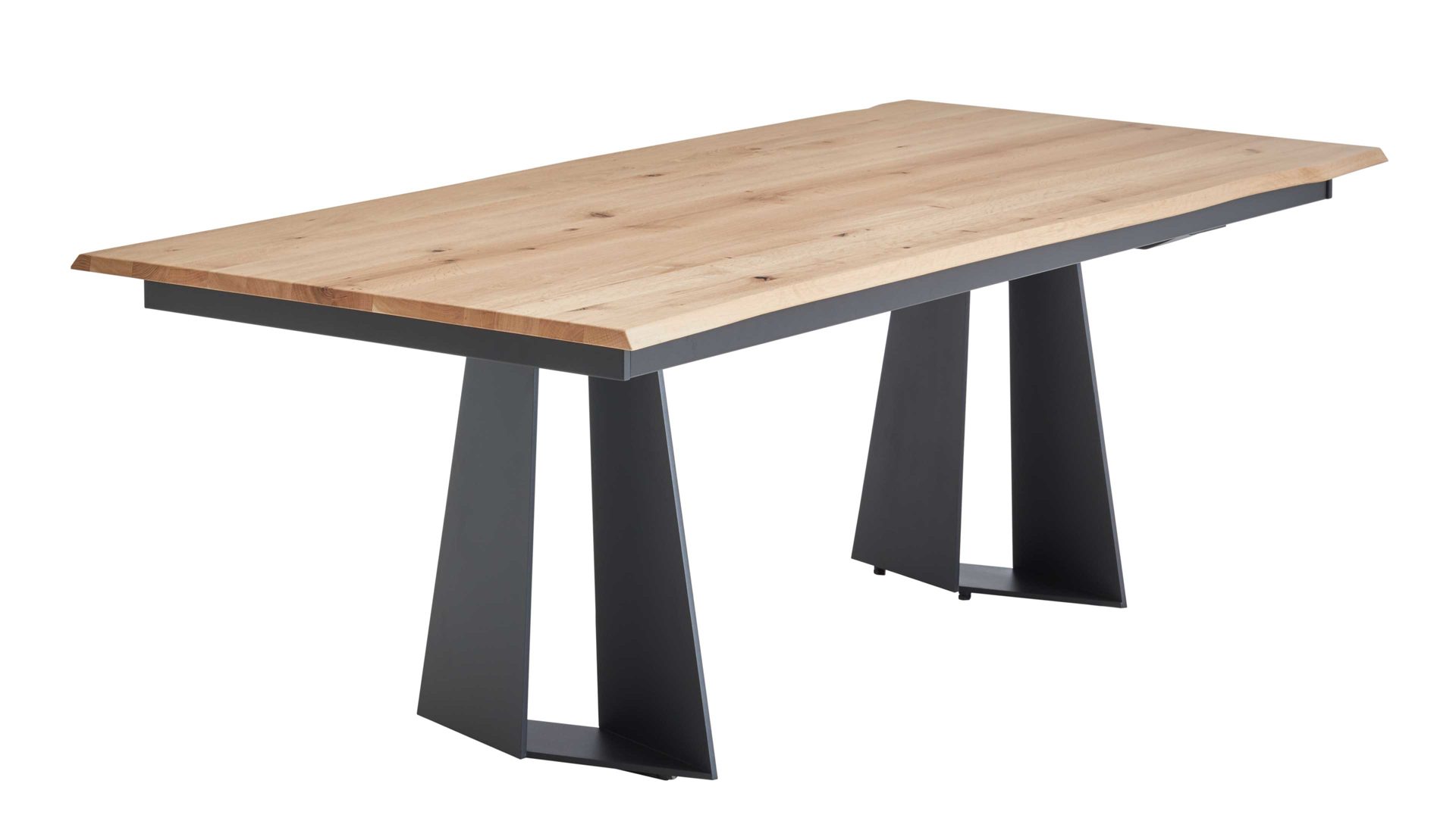 Wie die Tischplatte des modernen Esszimmertisches besteht auch die Klappeinlage aus Echtholz. Sie ist aus soft gebürsteter und geölter heller Wildeiche gefertigt und ca. 25 mm stark. Die Maße der Ansteckplatte belaufen sich auf ca. 65 x 100 cm (LxB).