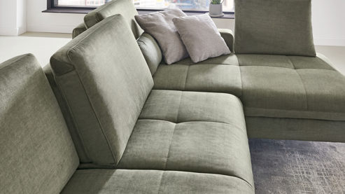 Des Weiteren können Sie einige Details an Ihre Wünsche und Bedürfnisse anpassen. Die Polstermöbel sind preisgleich mit einer soften Kaltschaum- oder etwas festeren Federkernpolsterung sowie mit mattschwarzen oder glänzenden Metallfüßen erhältlich. Darüber hinaus profitieren Sie von der umfangreichen Bezugauswahl. Es sind verschiedene Zusammenstellungen planbar, die sich mit vielen Funktionen ergänzen lassen.