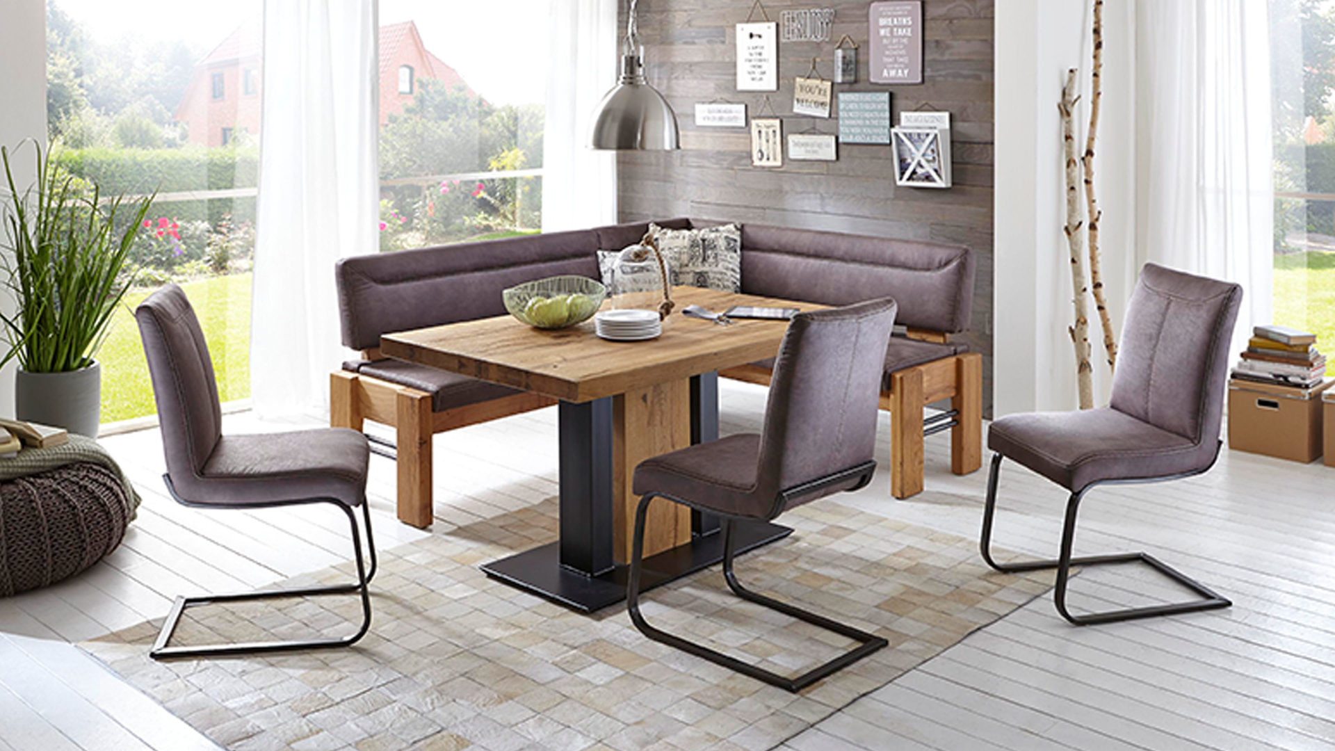 Die Abbildung zeigt ein Wohnbeispiel, welches auch Dekoration sowie separat erhältliches Zubehör enthält. Im Lieferumfang enthalten ist der Schwingstuhl Gino.