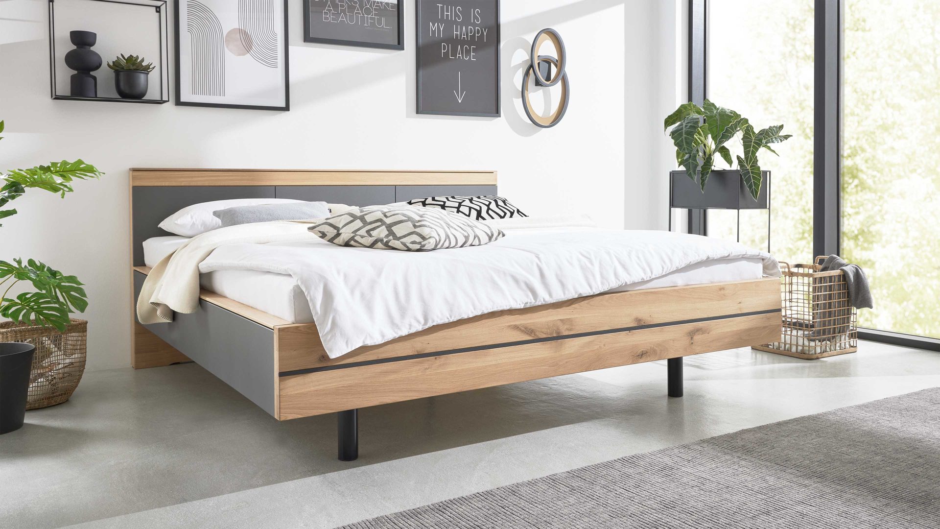 Das Bettgestell 528341 aus der Interliving Schlafzimmer Serie 1029 kombiniert Wildeiche-Massivholz mit graphitfarbenem Lack.
