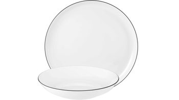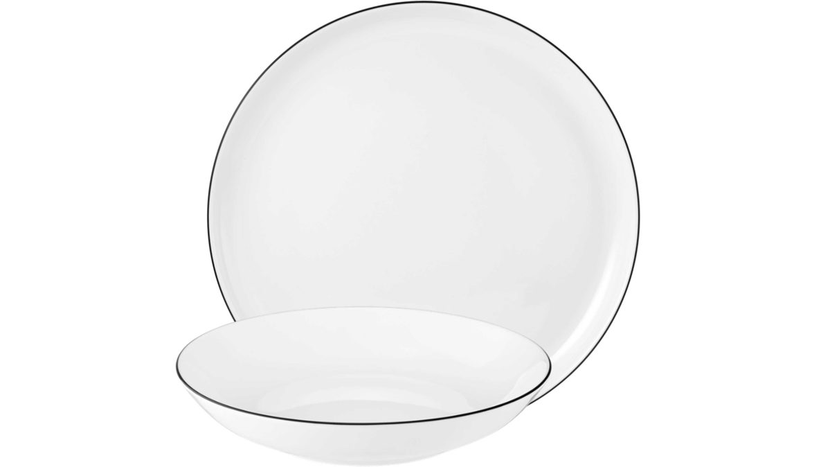 Das zwölfteilige Tafelservice Lido von Seltmann setzt sich aus sechs runden Speisentellern und sechs runden Suppentellern zusammen. Jeder Speisenteller hat einen Durchmesser von ca. 26 cm; bei den Suppentellern beläuft sich der Durchmesser auf ca. 21 cm. Alle Teller sind aus hochwertigem, weißem Porzellan hergestellt. Dessen stilvolle Optik sorgt in Kombination mit der feinen schwarzen Linie im Bereich des Tellerrands für eine durch und durch elegante Erscheinung, die den Esstisch ziert.