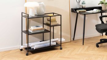 Dank der einfachen Montage lässt sich der Servierwagen schnell zusammenbauen. Er ist Teil einer Metallmöbel-Serie, die noch einige weitere Elemente in diesem stilvollen Industrie-Look umfasst. Dies gibt Ihnen die Gelegenheit, Ihre Räumlichkeiten harmonisch markant einzurichten. Jedoch sind die Möbel auch bestens als kreative Einzelstücke geeignet, die gezielt Akzente setzen.