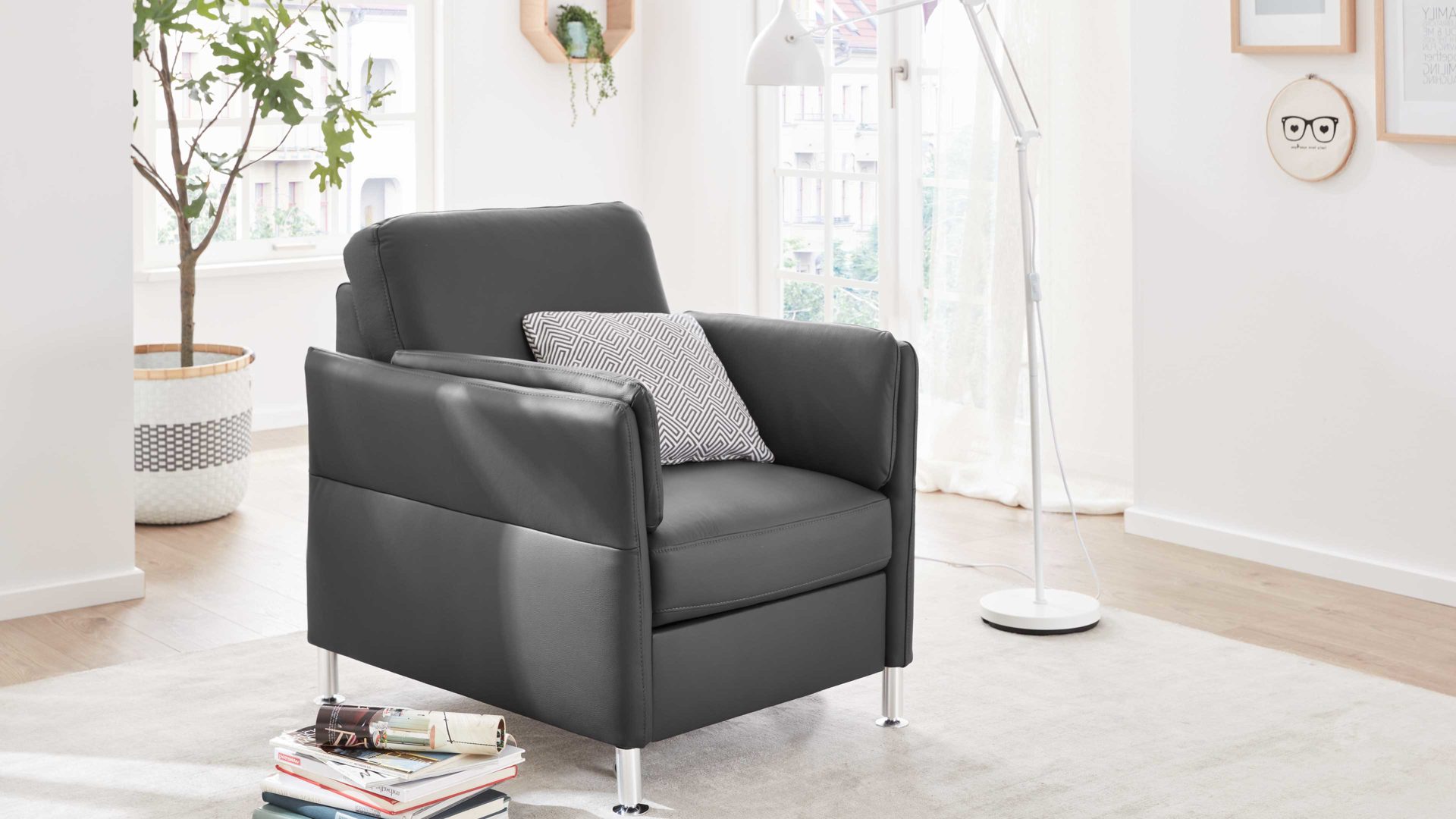 Der Modulmaster Sessel MM-PN1080 kombiniert schlichte alufarbene Metallfüße mit einem anthrazitfarben pigmentierten Lederbezug sowie stoffbezogenen Rücken im selben Farbton.