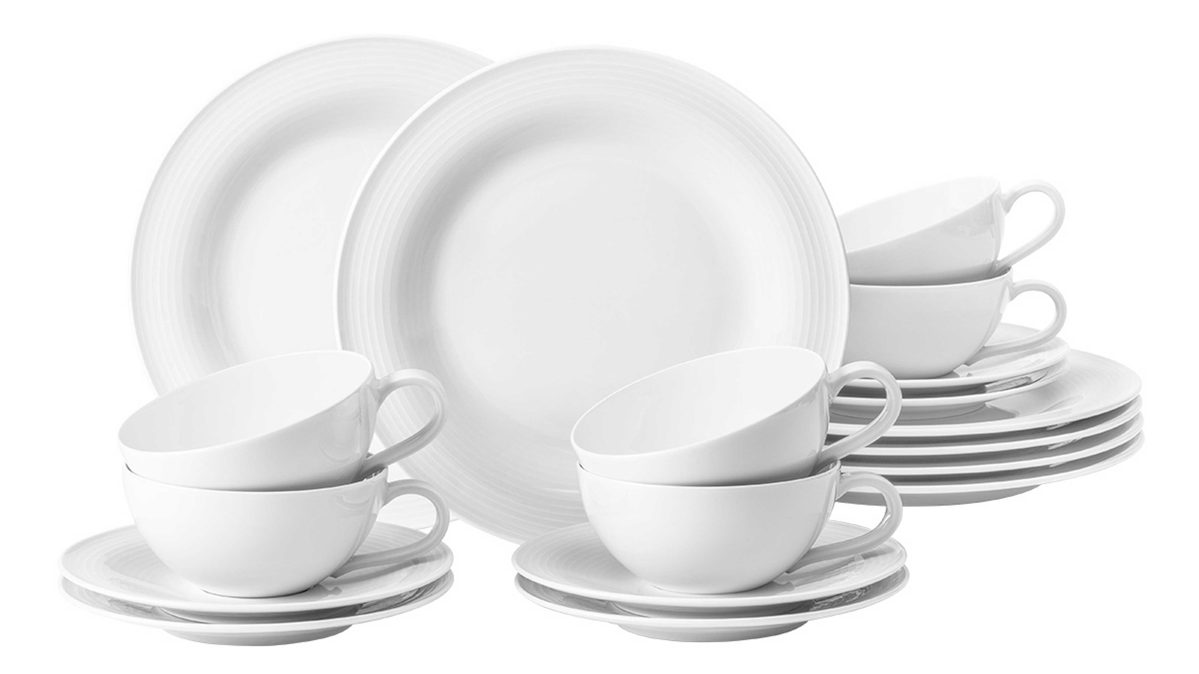 Seltmann Geschirrserie Beat 3 | Teeservice | 18-teilig | weißes Porzellan | sechs Teetassen, Fassungsvermögen ca. 300 ml, Durchmesser ca. 14 cm, Höhe ca. 6 cm | sechs Unterteller, Durchmesser ca. 17 cm | sechs Frühstücksteller, Durchmesser ca. 23 cm | ofenfest | mikrowellenfest | spülmaschinengeeignet | umfangreiche Porzellanserie | Made in Germany