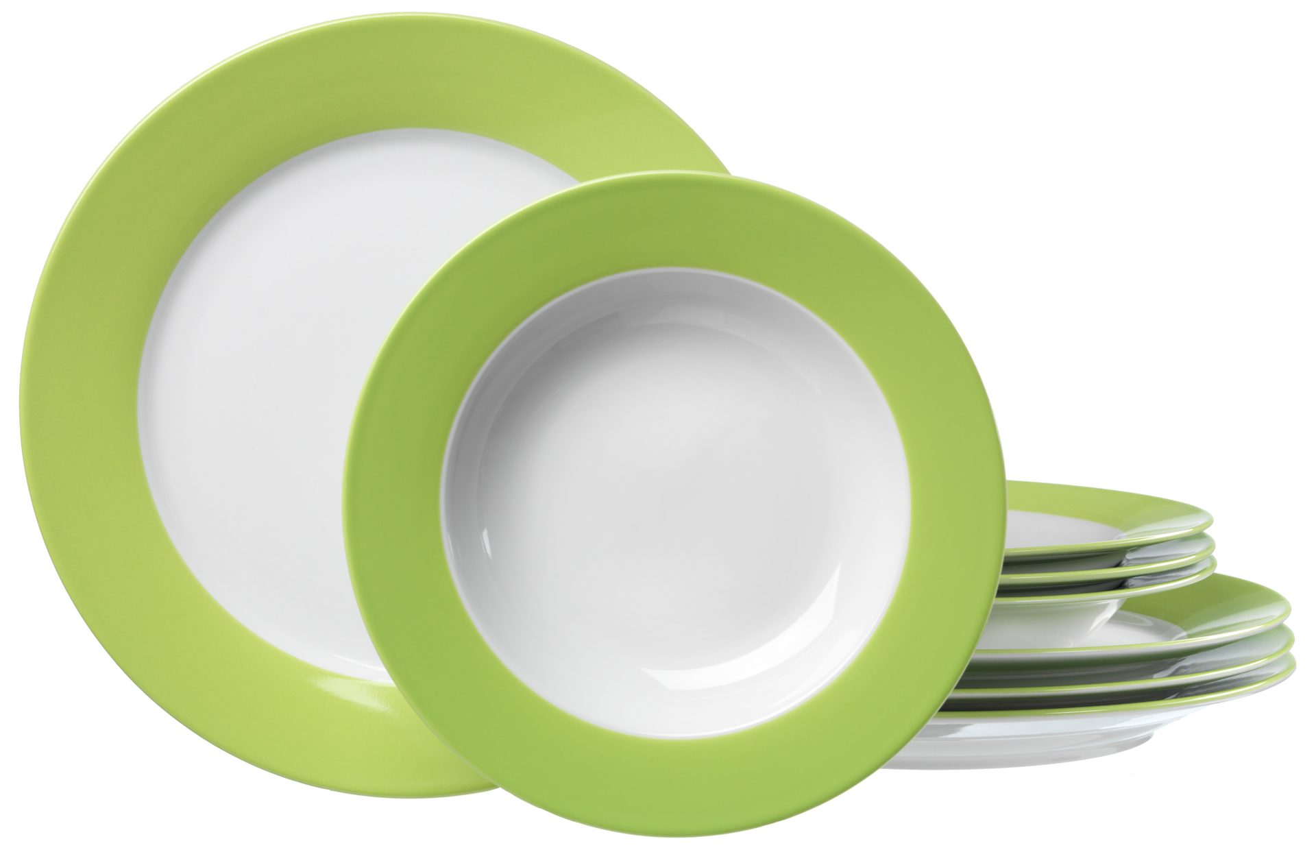 Bei diesem Tafelservice fügen sich die Hochwertigkeit des Materials und die klassische Eleganz des Designs zu einem edlen Ganzen zusammen. Das Geschirr aus erstklassigem Porzellan präsentiert sich schlicht in Weiß - stilvoll akzentuiert durch den grünen Rand, der dem Service eine freundlich-spritzige Ausstrahlung verleiht.