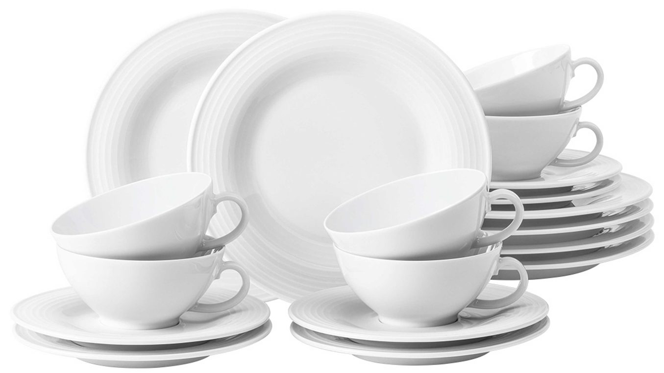 Seltmann Geschirrserie Beat 3 | Teeservice | 18-teilig | weißes Porzellan | sechs Teetassen, Fassungsvermögen ca. 140 ml, Durchmesser ca. 11 cm, Höhe ca. 6 cm | sechs Unterteller, Durchmesser ca. 14 cm | sechs Brotteller, Durchmesser ca. 17 cm | ofenfest | mikrowellenfest | spülmaschinengeeignet | umfangreiche Porzellanserie | Made in Germany