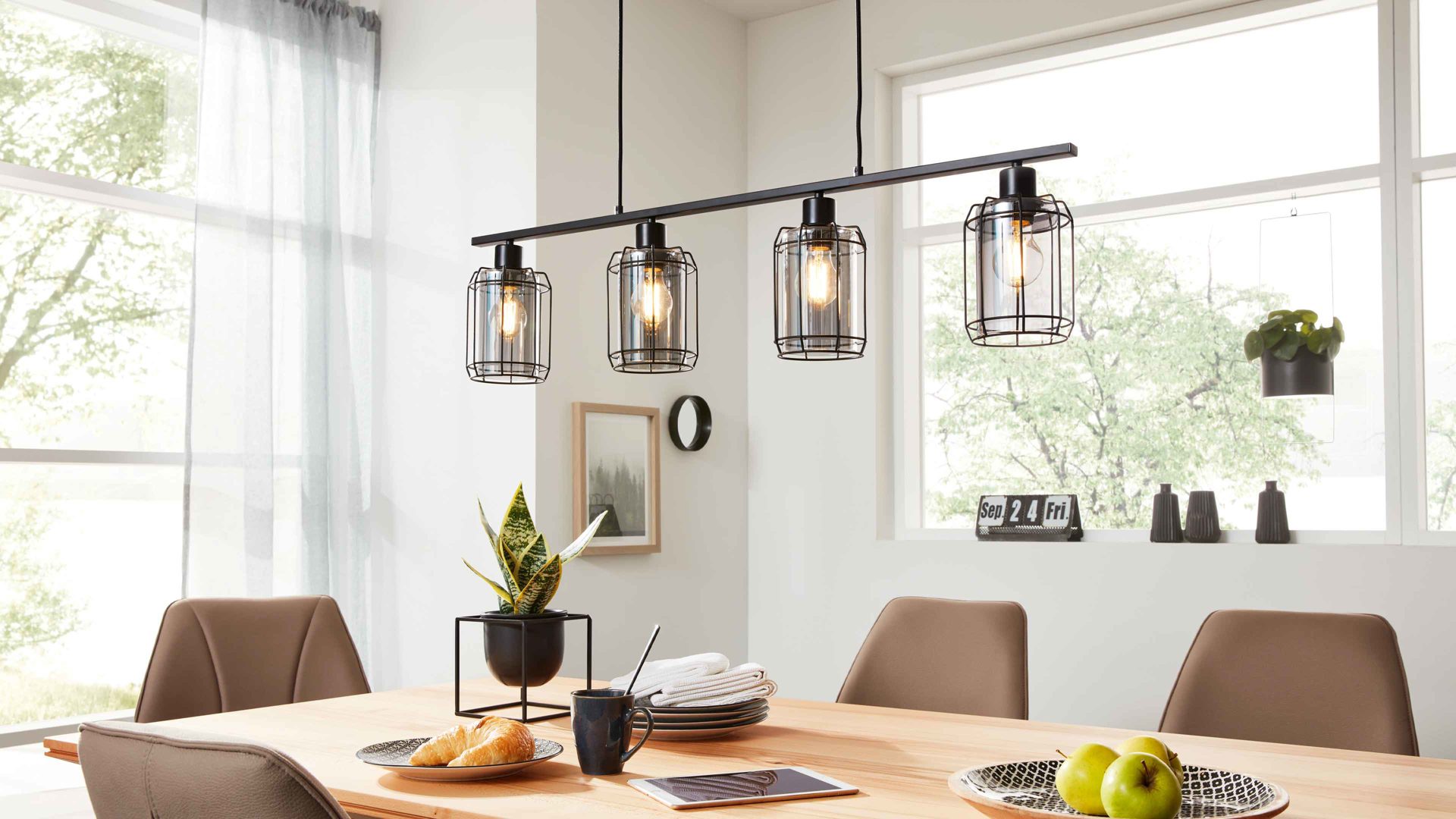 Mit ihrer Basis aus klassisch mattschwarzem Metall und den vier Lampenschirmen aus rauchfarbenem Glas vereint die Hängeleuchte aus der Interliving Leuchten Serie 9331 moderne Eleganz mit dem unverwechselbaren Charme des beliebten Industriestils. Das harmonische Zusammenspiel aus kühlem Metall und getöntem Glas sorgt für ein stilvolles Ambiente – perfekt für dein Esszimmer oder deine Küche.