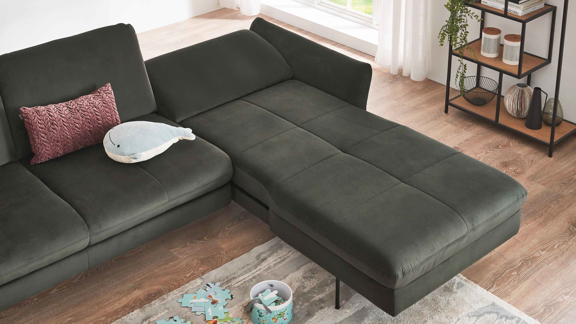 Zu den Highlights des Polsterprogramms gehören die grundsätzlich im Originalstoff bezogenen Rückseiten sowie die für Staubsaugerroboter ideale Bodenfreiheit. Die Serie ist Made in Europe und mit dem Goldenen M ausgezeichnet.