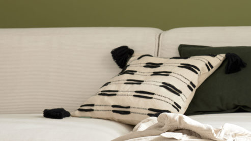 Kissenbezug mit aufwändig eingenähten Wollfäden, unifarbener Rückseite und Quasten an jeder Ecke