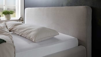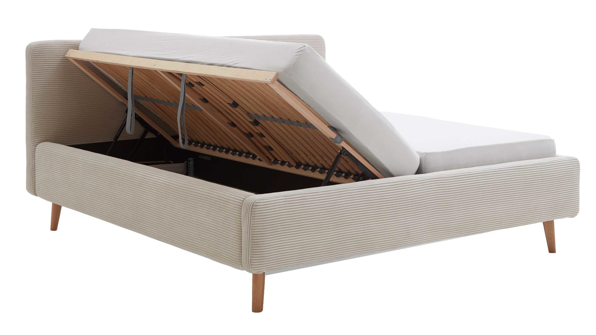Das Polsterbettgestell Mattis mit Bettkasten begeistert durch die elegante Trendoptik sowie die exzellente Material- und Verarbeitungsqualität. Es kombiniert eichefarbene Holzfüße mit einem beigefarbenen Breitcordbezug. Sowohl die Bettseiten als auch das Polsterkopfteil sind glatt bezogen. Letzteres lädt Sie ein, sich anzulehnen, wenn Sie abends im Bett vor dem Schlafen noch fernsehen oder in einem Buch lesen.