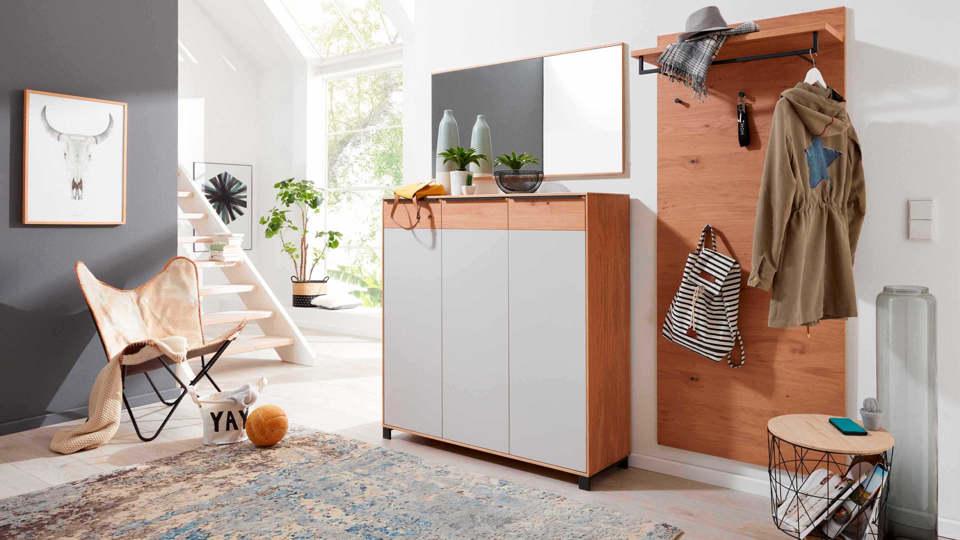 • Die Abbildung zeigt ein Wohnbeispiel, welches auch Dekoration sowie separat erhältliches Zubehör enthält. Im Lieferumfang enthalten sind ein Schuhschrank, ein Spiegel und zwei Wandgarderoben.